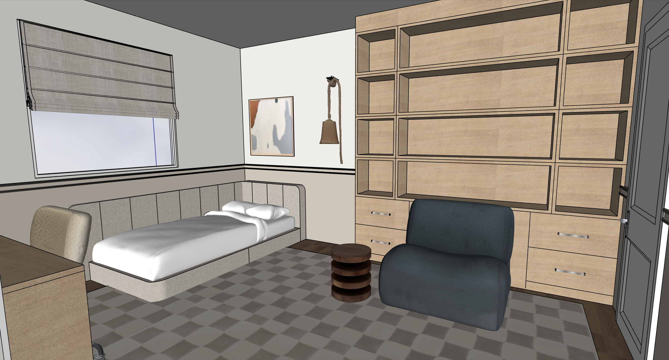 extra large checkered rug in grey and ivory the walls are split by a molding the molding and bottom half are light grey and the top is ivory