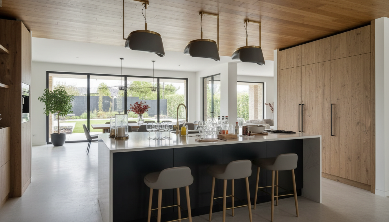 interior shot create a rendering of a bathroom with dark wood tones in the vanity add shower faucet and glass above tub change tile to dark color architecture