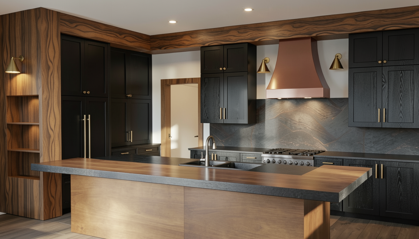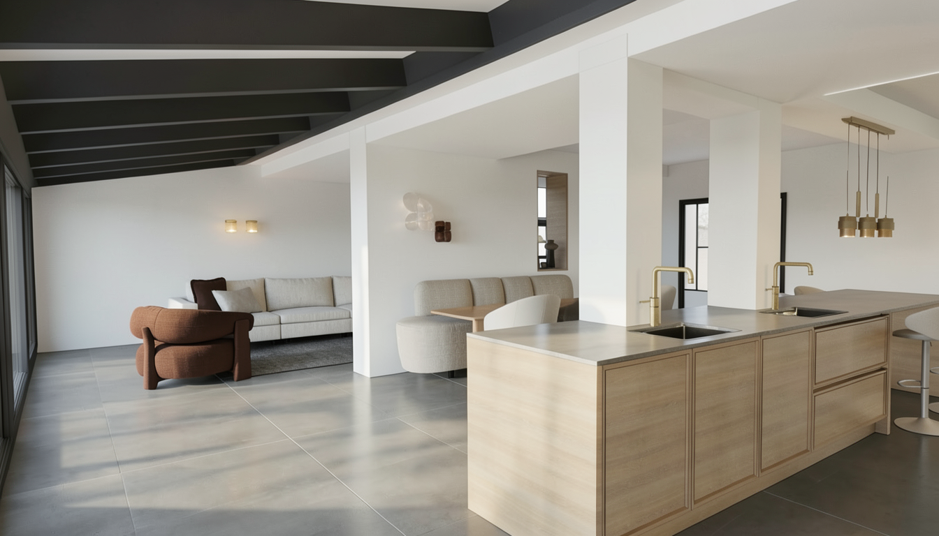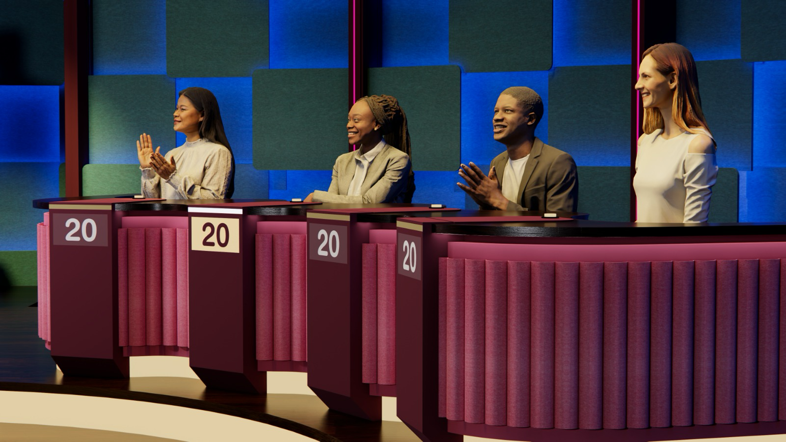 the black squares in the background are blue each individual square in the background consists primarily of blue with purple pink and orange tones the shadows are black the entire image is more saturated the vertical led line in the background emit an orange light the light under the desk have a warm glow vibrant colors highly saturated high contrast the color of the desk will be retained increase color saturation enhance contrast make the colors more vibrant while maintaining the architectural forms the light on the persons face remains the same as in the original photo do not change or add new structural elements there is no floor no dark shadow in the back no black in the background