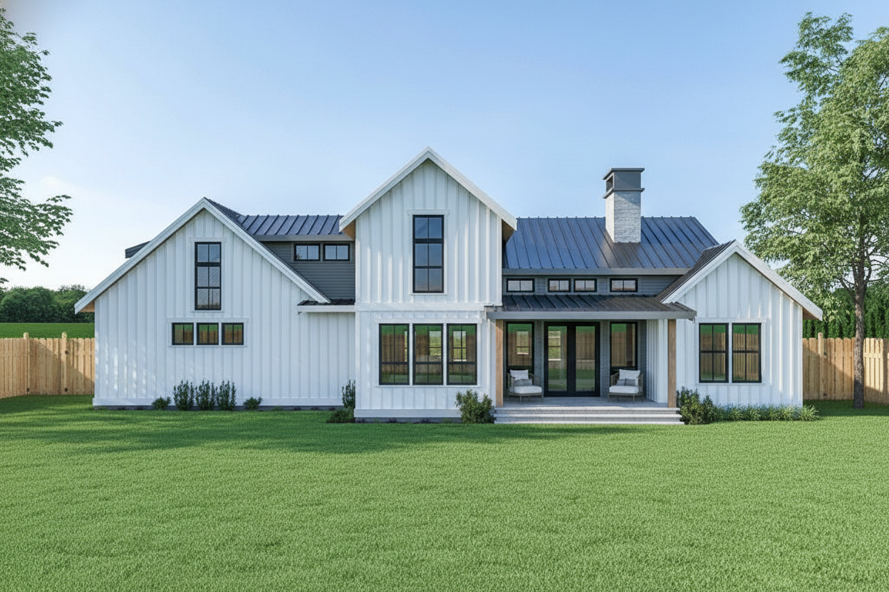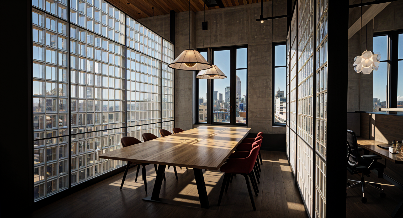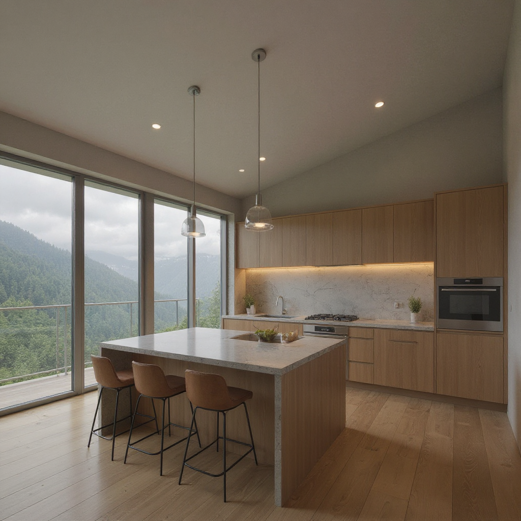 interior watercolor rendering of contemporary second story kitchen with sloped cieling outside of windows is view of misty forest clouds over a cliff with cozy funiture and futuristic glass and stone