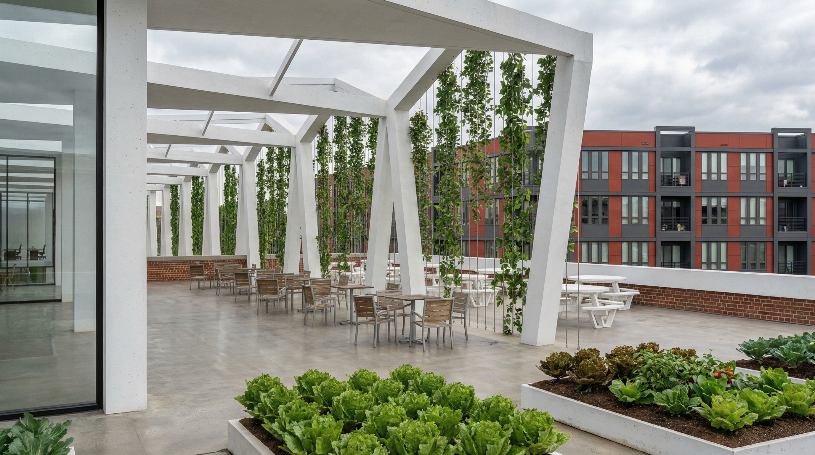 do not change any architecture geometry framing planter locations vine locations tables or camera angle only enhance realism vegetation keep all planter boxes where they are add more variety mixed herbs leafy greens vegetables and different growth stages improve soil texture and make plants look natural not repetitive keep vines in the same locations but make them more realistic and varied background building keep the same massing and color layout make it feel slightly further away by softening contrast and adding mild atmospheric depth not blur improve material realism windows and shadows materials surfaces add realistic matte concrete texture to the floor improve realism of tables chairs with subtle weathering make the white structural frames slightly textured and matte lighting sky use soft overcast light with neutral clouds avoid any bright blue sky or harsh saturation overall goal improve realism plant diversity and atmospheric depth without changing the model or layout at all