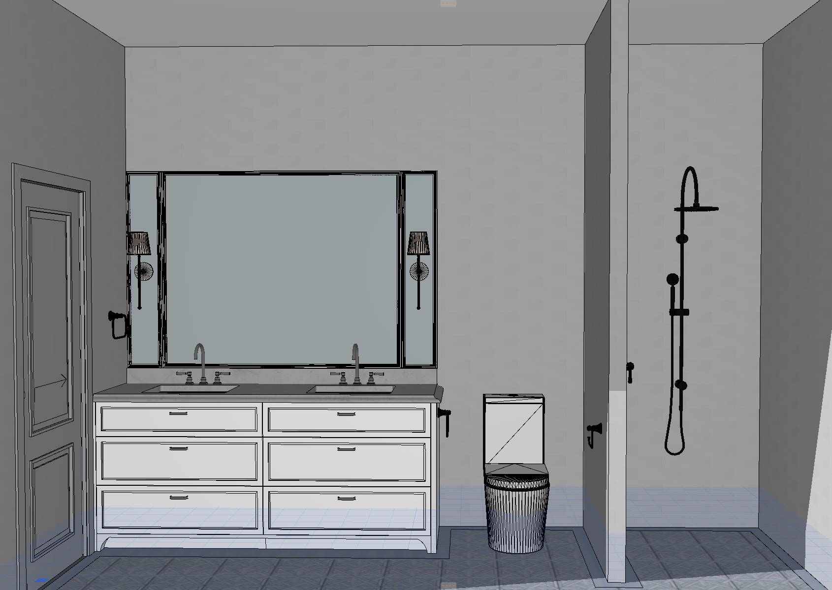 make this image look more photo realistic the shower tapware cabinetry hardware and wall lights are polished nickel the cabinetry and mirror frame are white the walls are an undulated white subway tile that is brick stacked the floor is a white and pale blue marble mosaic in versailles parquestry design with a pale blue marble border that runs around the border of the room