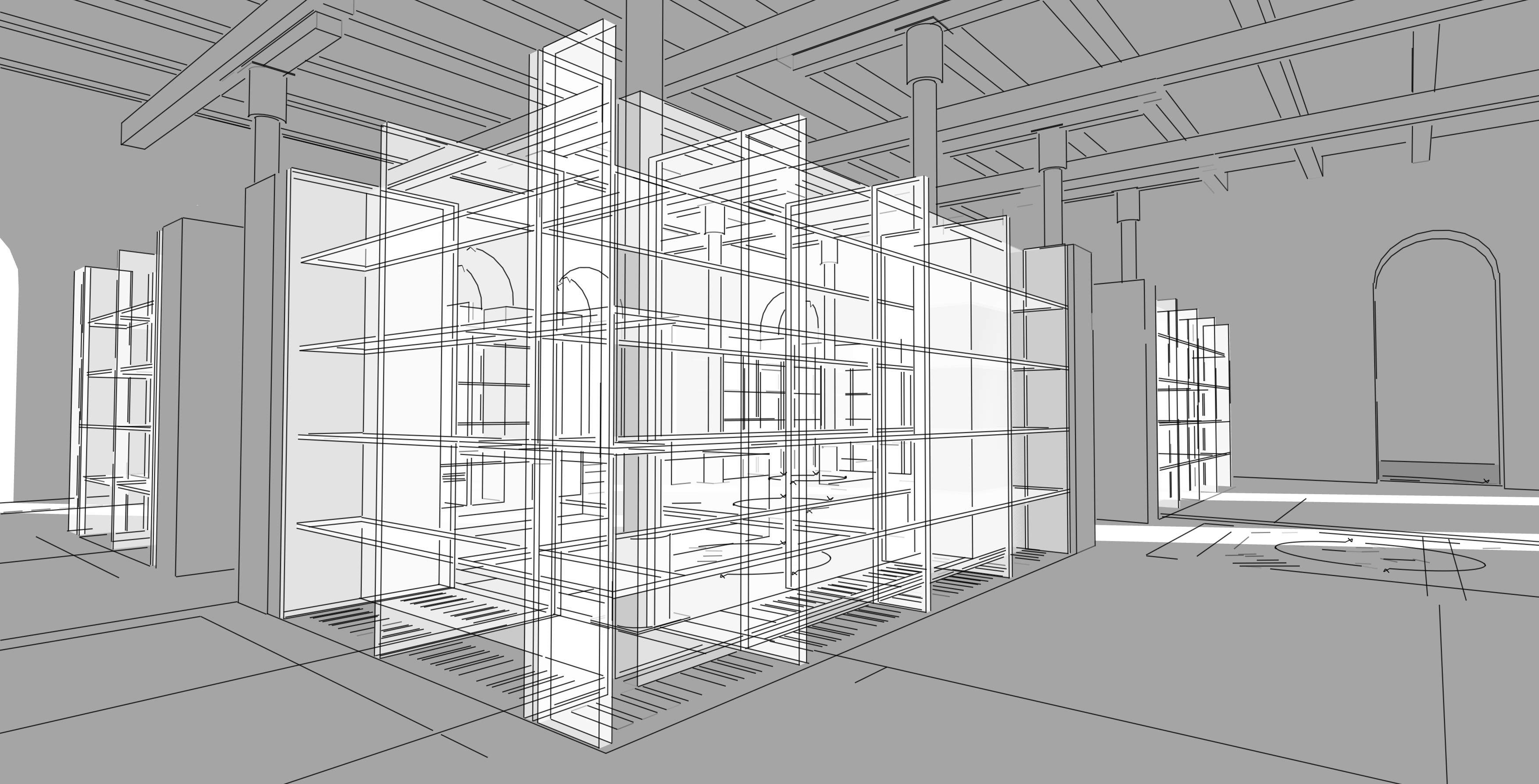 generate trnsparent plastic in brown red make column and beam structure in painted cream white dont place objects on shelves retain sun light effect limestone on floor clear windows