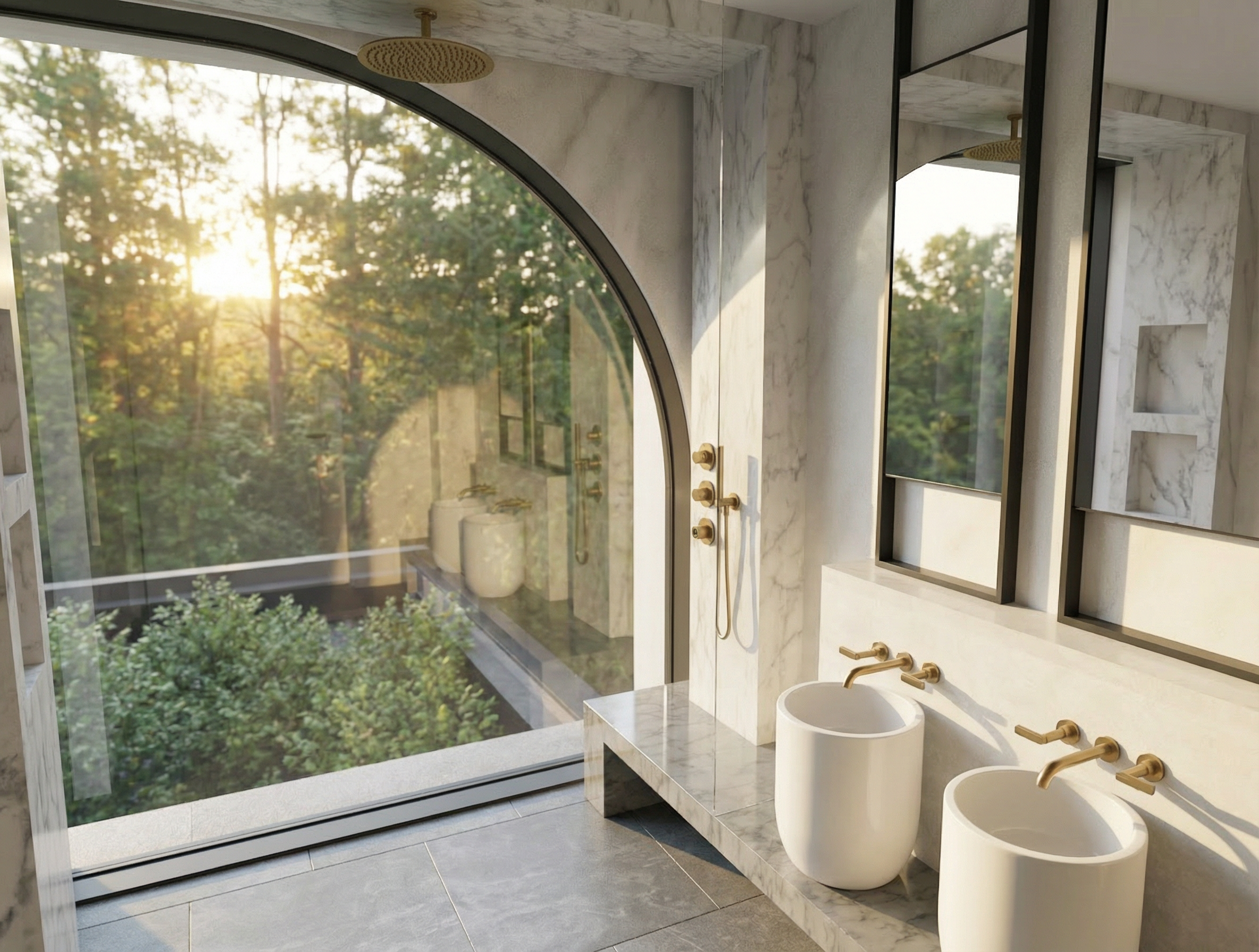 use the provided enscape render as base reference keep exact layout proportions and camera angle enhance warm lighting and refine materials warm sunlight add one elderly man and one elderly woman sitting at the table close to the window drinking coffee ensure anatomically correct human proportions