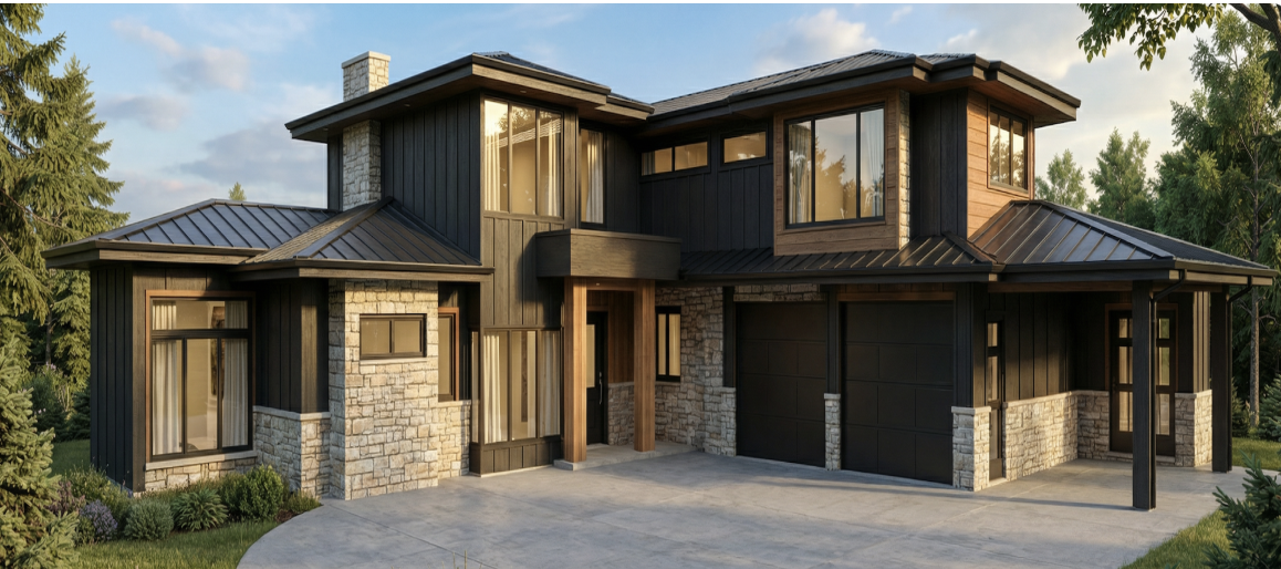 change front entry door to solid black door with 2 sidelights add a stack of 3 horizontal frosted windows each garage door make the windows only half the width of the garage door