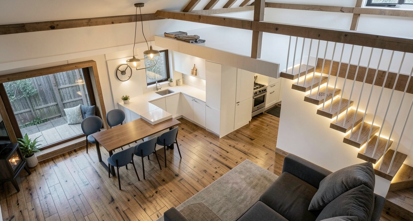 natural daylight from the left window turn on the 2 wall light and add led in the niche cabinet do not add anything to the cabinets add 2 down lights to create a cosy setting