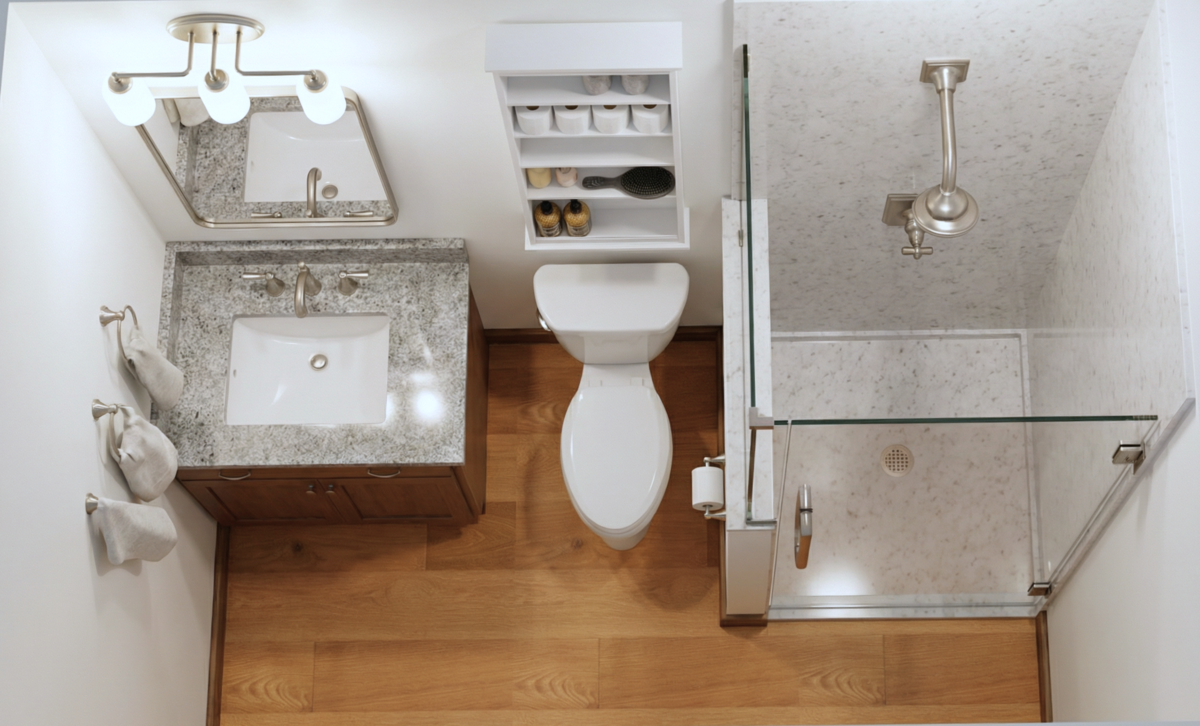 keep everything the same except make the shelf above the toilet a wood color to match the vanity make it 9inch deep and 24 inches wide with 2 shelves make the shower walls a white panel with a niche on the right wall