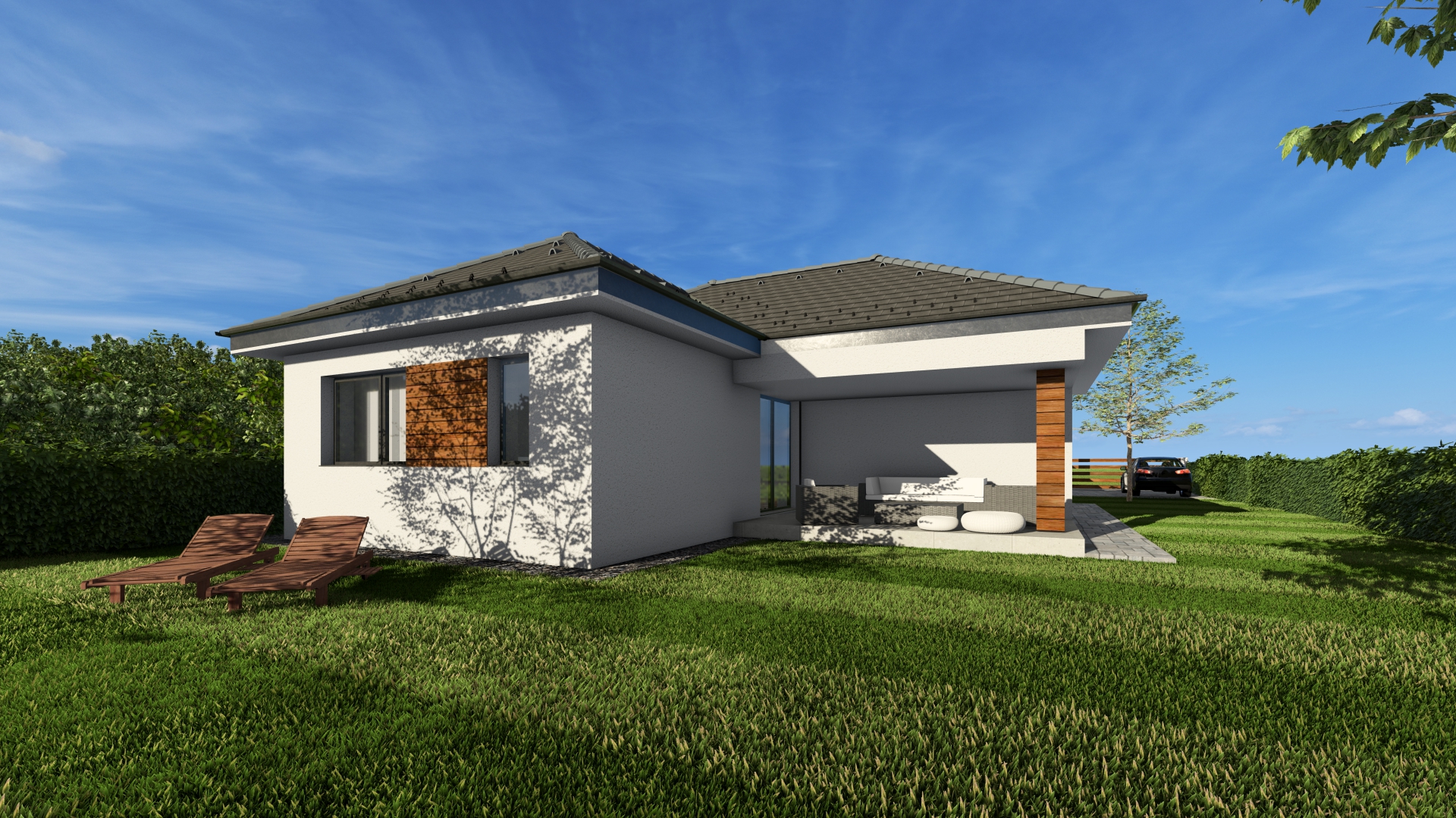 render a photorealistic 3d perspective of this house in a hungary do not change the view keep model geometry the same windows doors roof walls pavement driveway fences facade decor sidewalk hyper realistic 8k cinematic lighting serene atmosphere photorealistic textures realistic reflections reference the current material style just enhance them only enhance the current materials and make the landscape nicer vegetation detailed textures in the wood siding and glass reflections and a vibrant clear sky with light atmospheric depth render in hyper realistic architectural visualization quality 8k resolution roof minimalist anthracite concrete tile facade a mix of smooth white mineral plaster horizontal walnut wood slats windows antracit aluminium minimal fence anthracite colored premium metal mesh landscape professional minimalist garden design green clean cut grass 2 young maple tree prunus laurocerasus whether nice clear early summer in middle europe outside the fence some new family houses natural hungarian great plain native landscape do not add more fence and wooden facade decor not change the composition