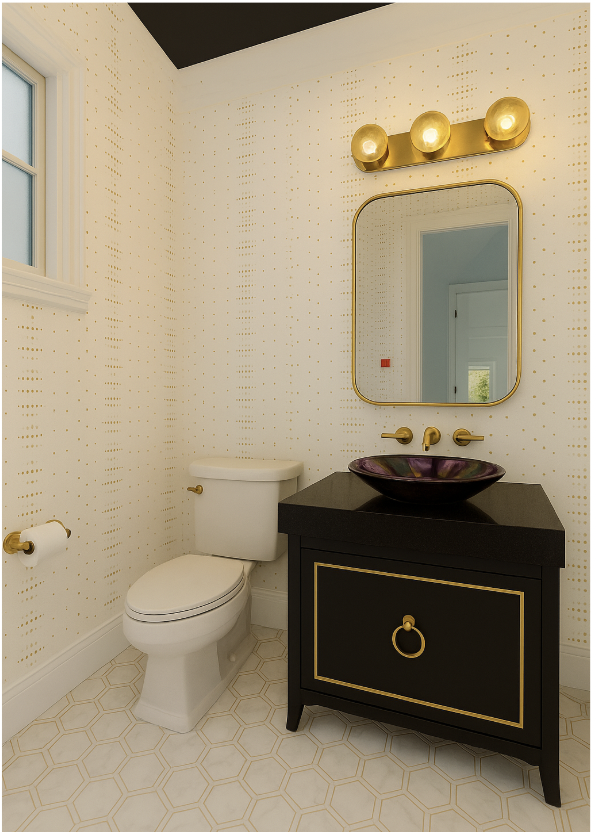 create a hyper realistic image of this bathroom extend the black quartz apron sink stone across the top of the toilet creating a 6 shelf for a planter to sit change the wall mounted faucets to a deck mounted faucet that is gold with glass handles