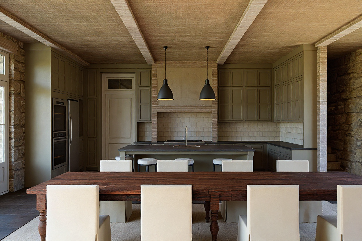 clean modern french country aesthetic grasscloth ceiling classical chunky crown molding around ceiling plush and cozy window seat mahogany four poster bed with overstuffed duvet excessively large thick vintage sisal rug