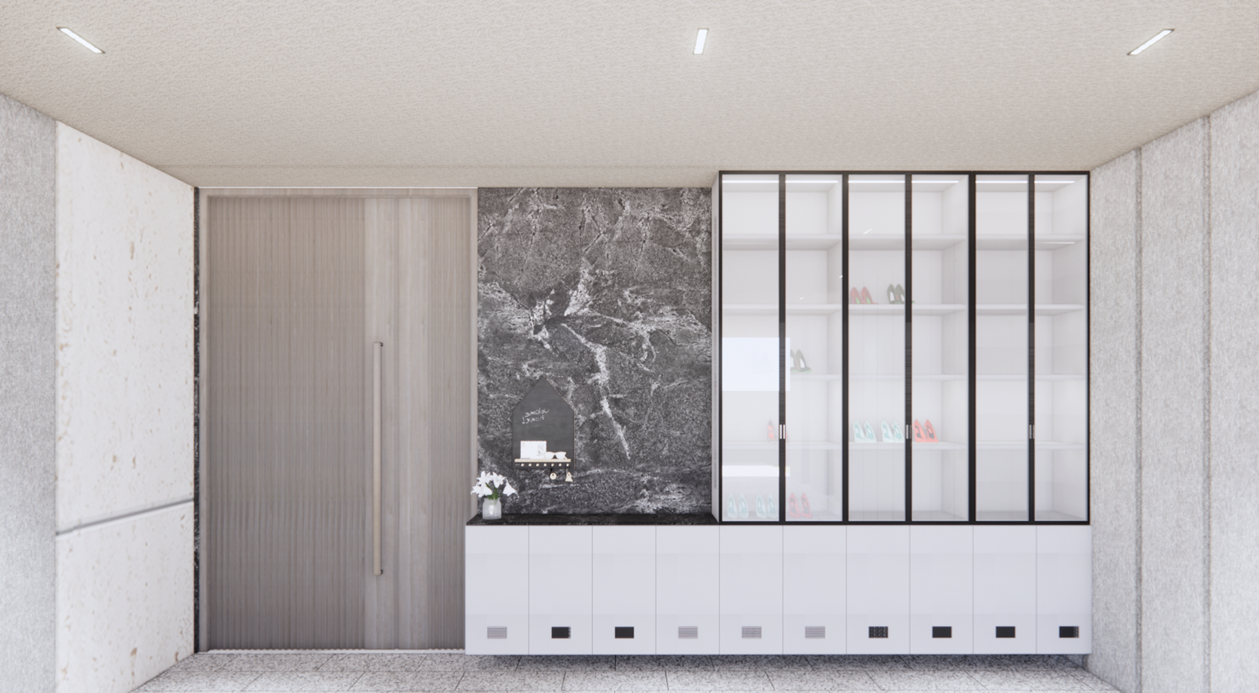 more realistic remove sunlight show more lighting at all glass cabinet at night view