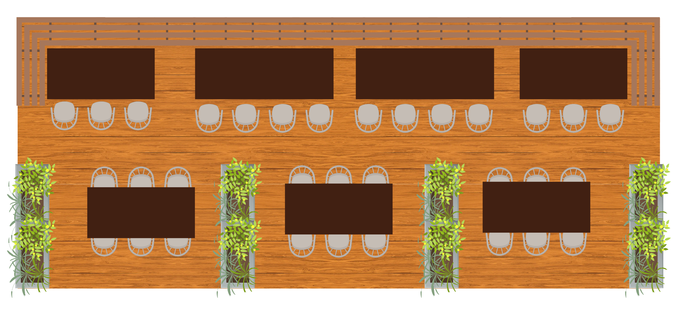 aerial shot render a top down view of a warm and cozy outdoor cafe setting use rich brown tones for the tables to convey warmth and sophistication the chairs should be a soft taupe color offering a comfortable and inviting appeal implement a vibrant natural wood color for the flooring adding a rustic charm place lush green plants in grey planters along the edges for a touch of freshness and tranquility the atmosphere should be serene and welcoming evoking a sense of relaxation and leisure in a sunlit environment