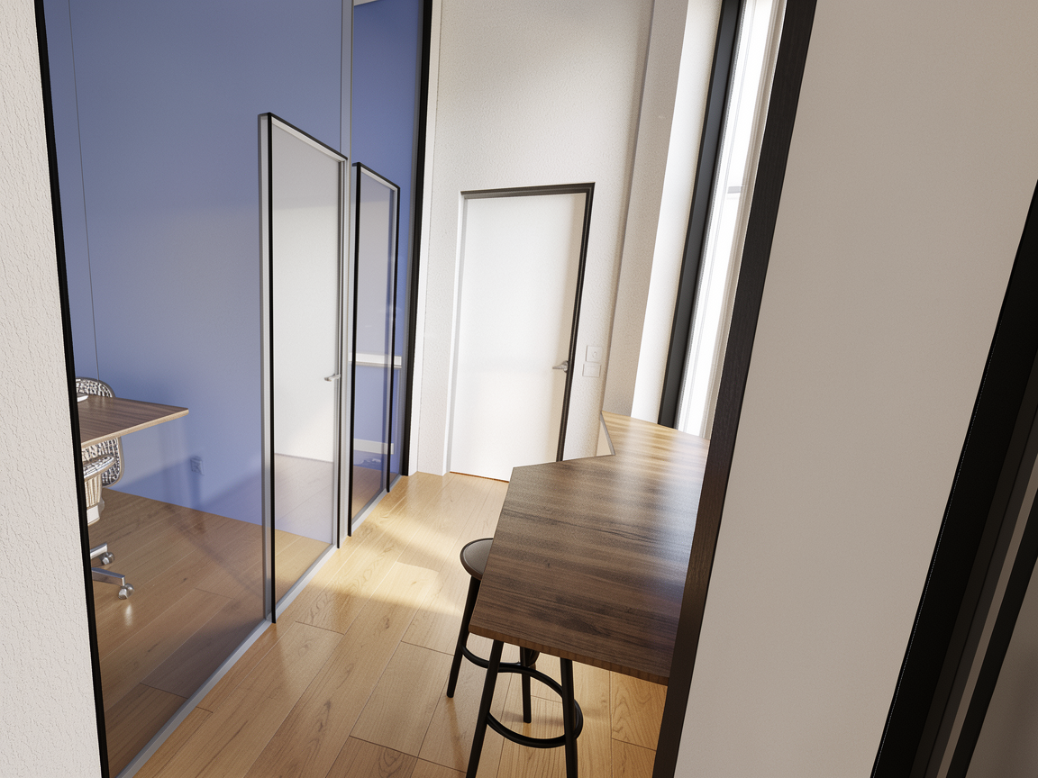 make a photo realistic render use natural light put natural light i the room as if its golden hour add typical office panelled ceiling with the general light on add accent lighting behind the actual tv not the beige panel be very precise with the render don t add any new objects add people in wheelchairs watching tv keep the curtains across the whole wall behind the tv