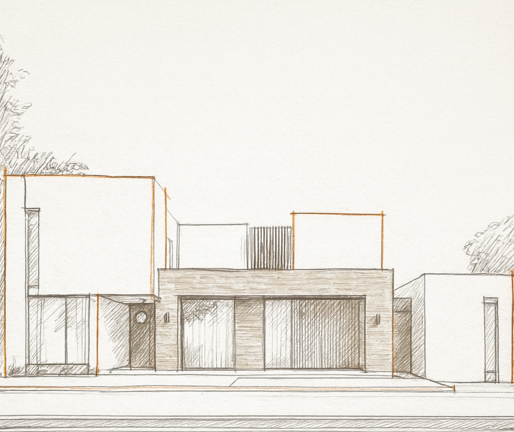 modernist exterior shot a modern living room with a serene atmosphere featuring a large l shaped sofa with light beige upholstery paired with a round wooden coffee table in rich walnut brown the walls are painted in a soft ivory with a matte finish include a large flat screen tv with a black frame add built in shelves with minimalist decor items vases and books in muted earth tones the floor is covered with a light grey area rug with subtle geometric patterns ensure warm ambient lighting from a stylish chandelier above place a few indoor plants with deep green foliage for an organic touch the room should feel cozy and inviting with a balance of natural and artificial lighting to create a vibrant yet calming atmosphere architecture