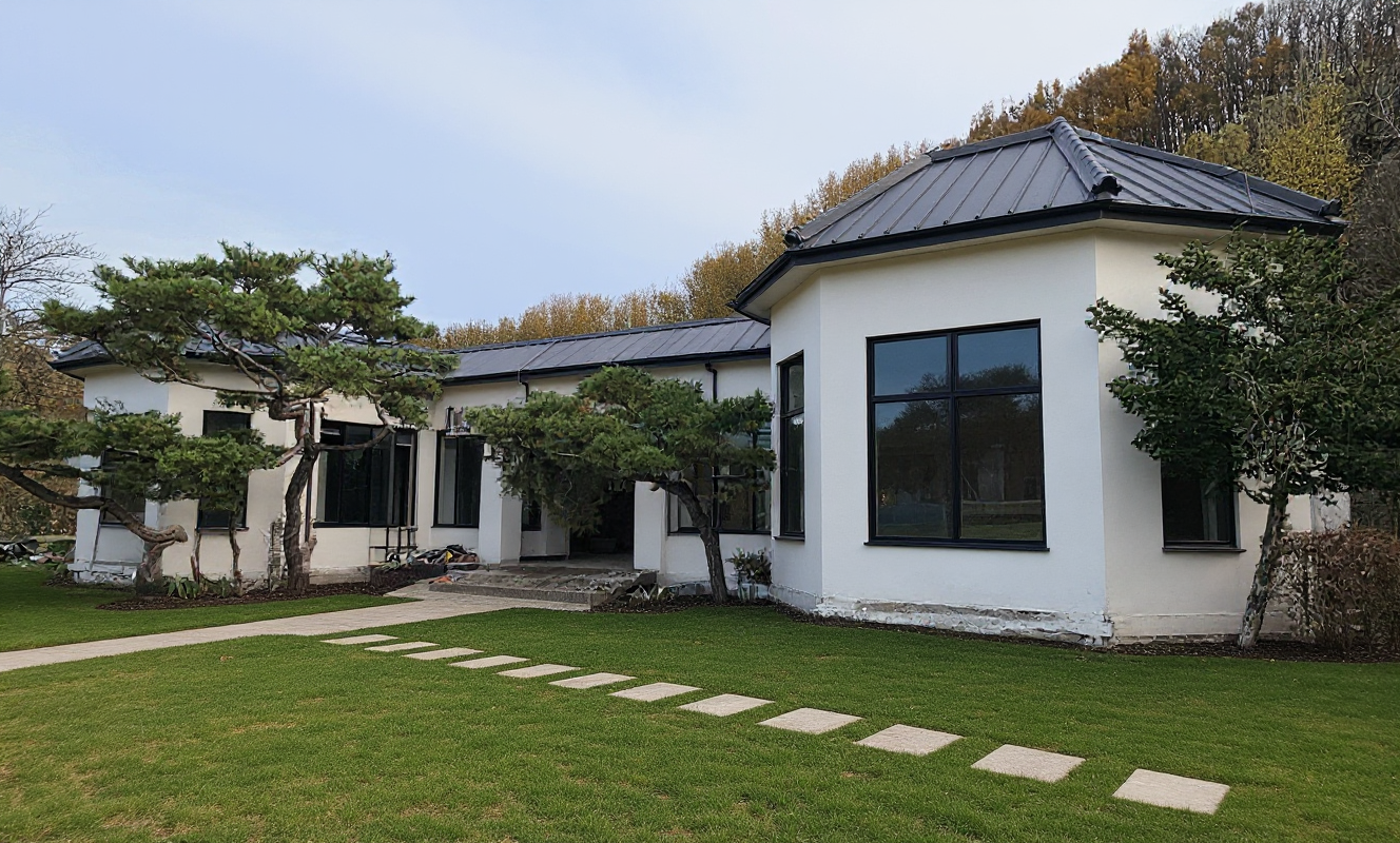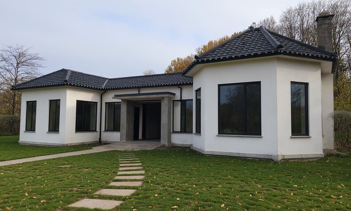 modern style industrial black frame canopy concrete keep the canopy column wall finishing white color and plywood remove the arch the window is a fixed window frame the front garden has grass and stepping stones it s like a calm china restaurant
