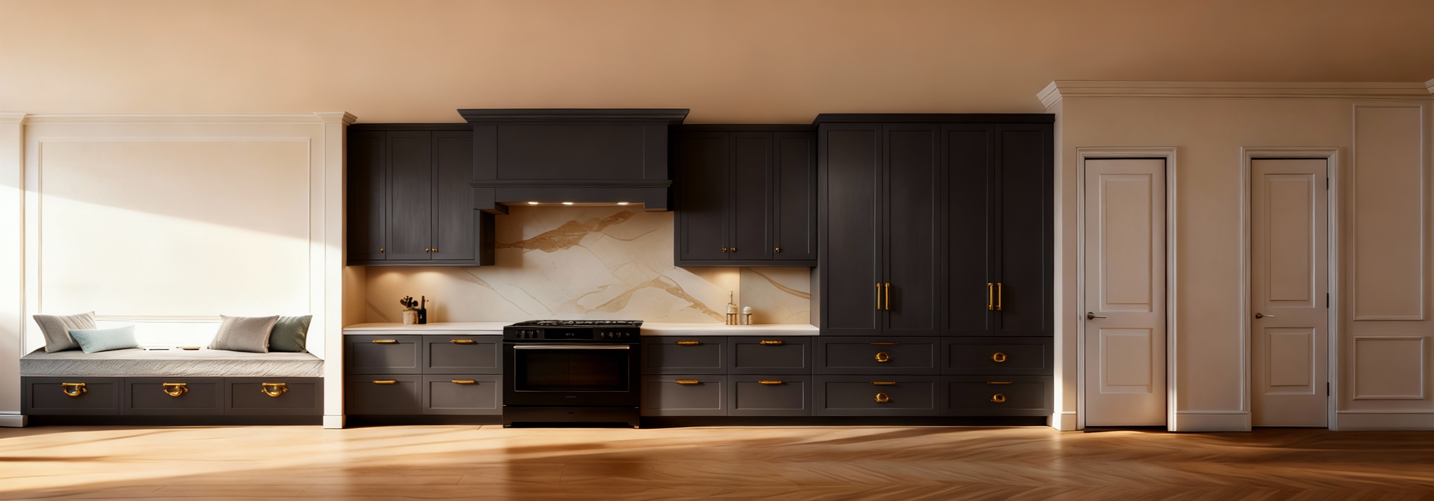 same kitchen cabinets hardware in brass and stove in black
