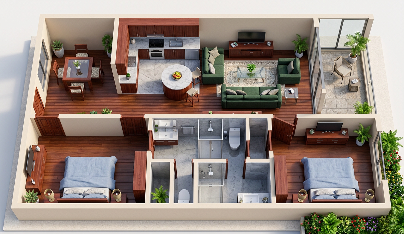 convert this floor plan into a realistic isometric 3d view of a full house show the space from an elevated angle with furniture walls and details visible render a modern luxurious house floor plan with an open and airy atmosphere use a soothing color palette with soft whites and light grays for the walls and structural elements incorporate warm wooden textures in light oak for flooring and furniture add pops of color with deep blue and emerald green accents in decor and furniture use large floor to ceiling windows allowing natural light to fill the space creating a bright and inviting ambiance add touches of indoor greenery for a fresh and vibrant vibe use the same furniture as shows on the plan do not change the orientation of the floorplan