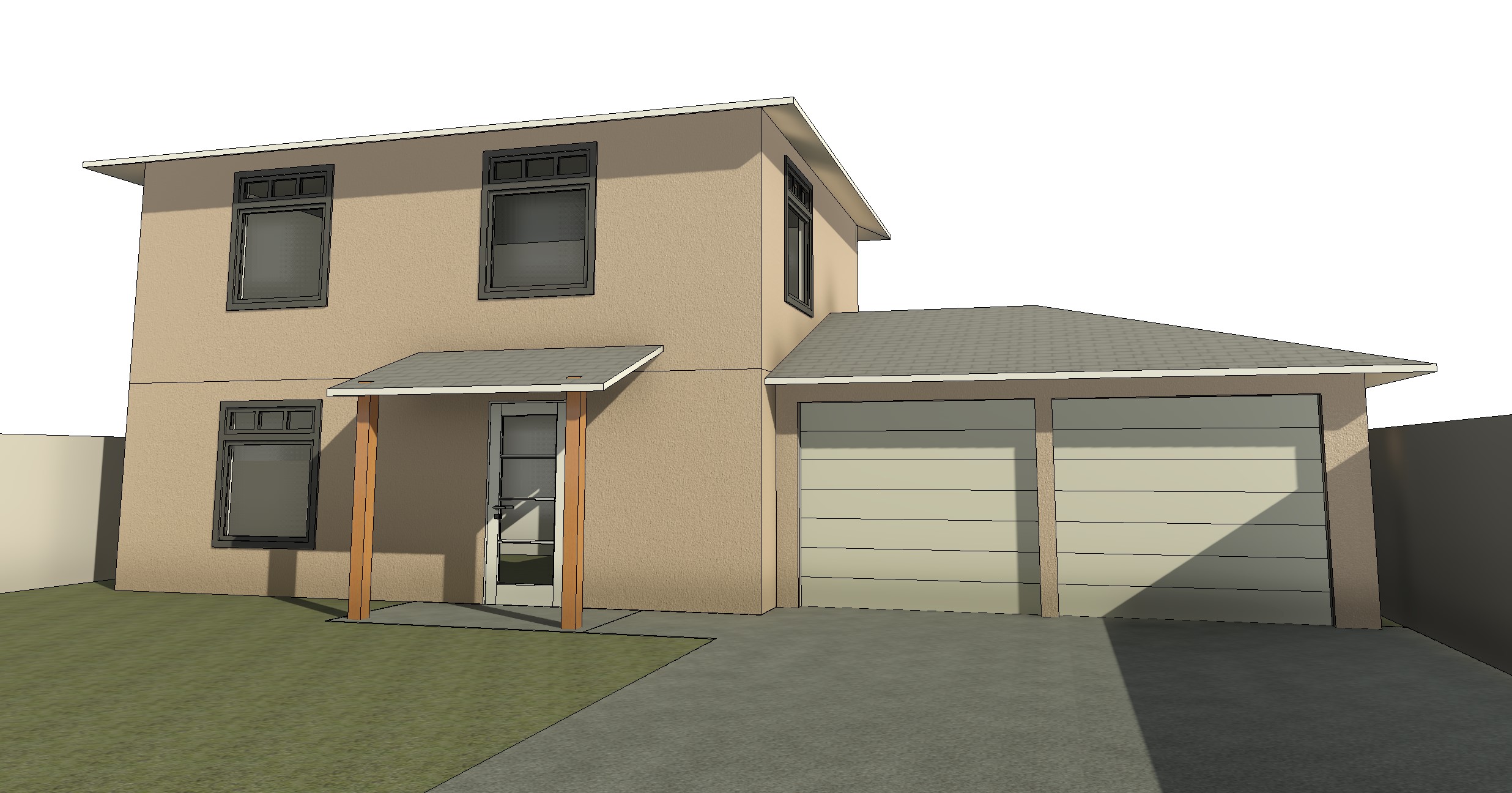 exterior shot convert to a farmhouse style with vertical board and batten walls and cedar wood window trims with california native landscape and trees
