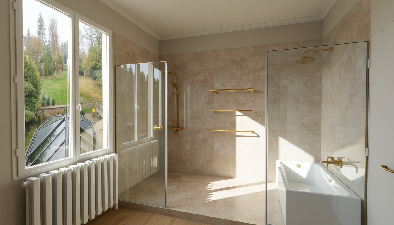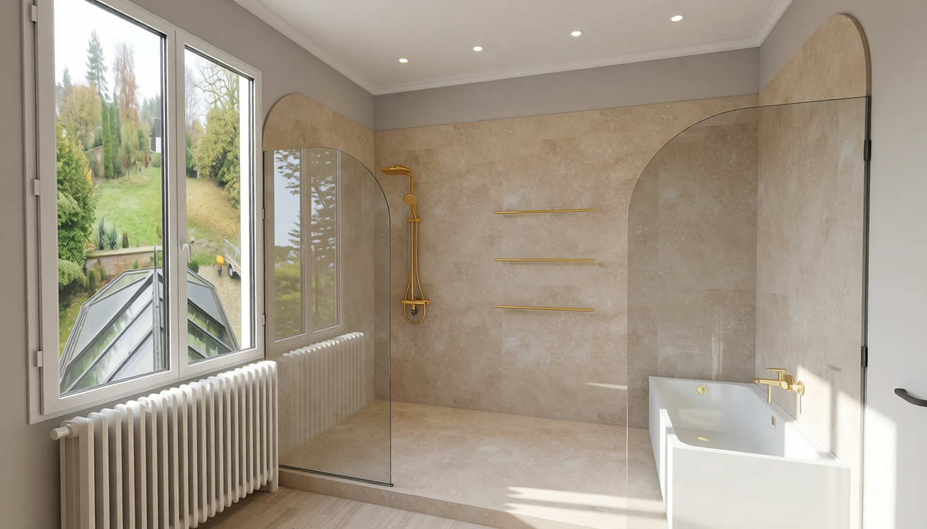 laisse les parois de douches en verre de chaque c t celles ci doivent tre arrondies dans les angles int rieurs haut mais le carrelage ne change pas ne mets pas d clairage artificiel