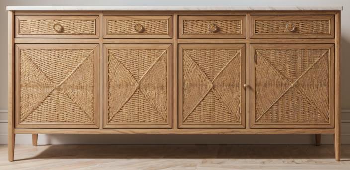 accent raffia weaving for cabinet doors and drawers with the same handles and wooden finish