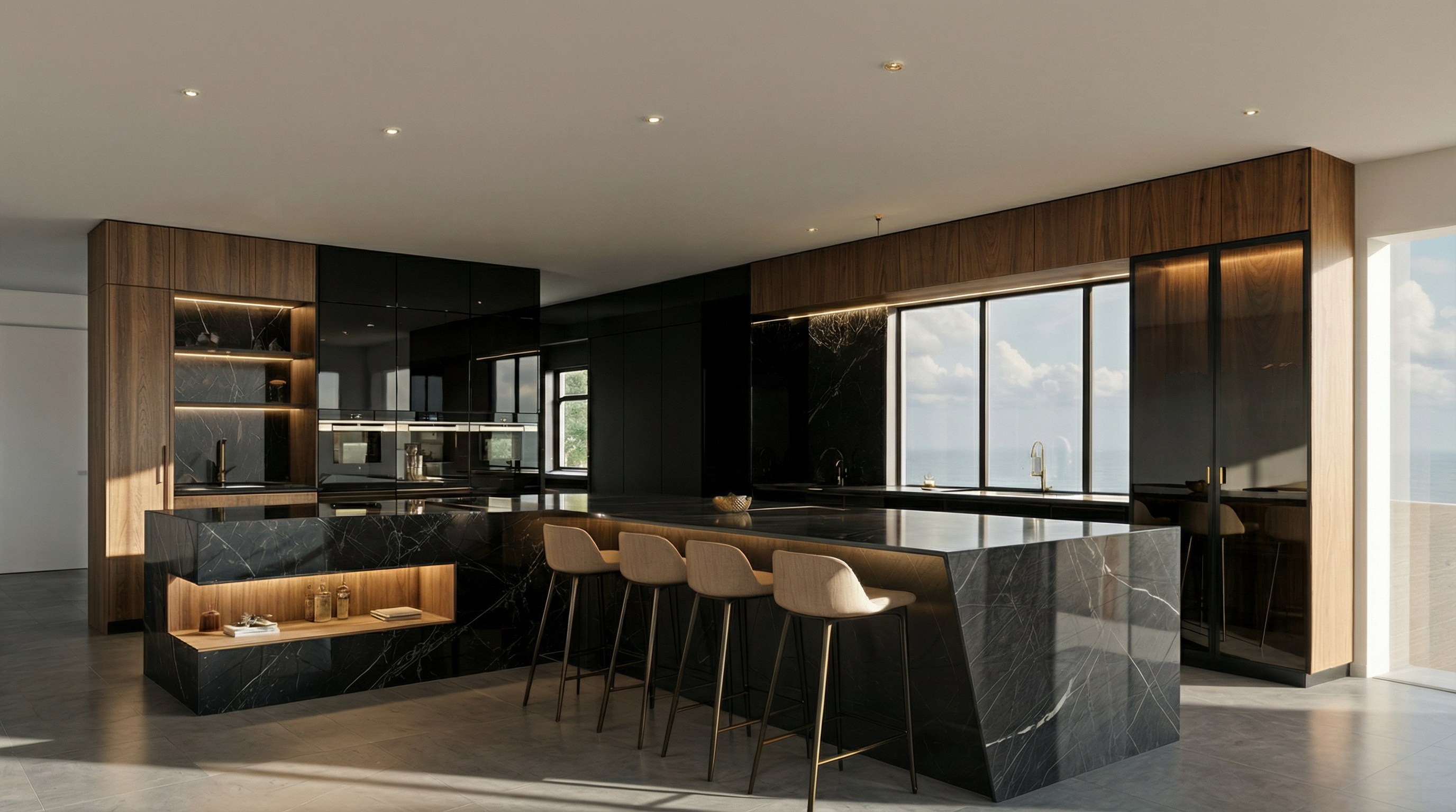 can you make all the black cabinets at the back wall high gloss aswell keep the rest exactly the same add some more lighting to the ceiling to create more light reflections on the gloss cabinets