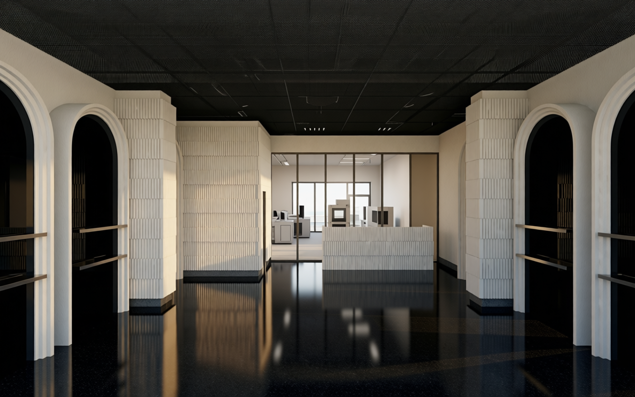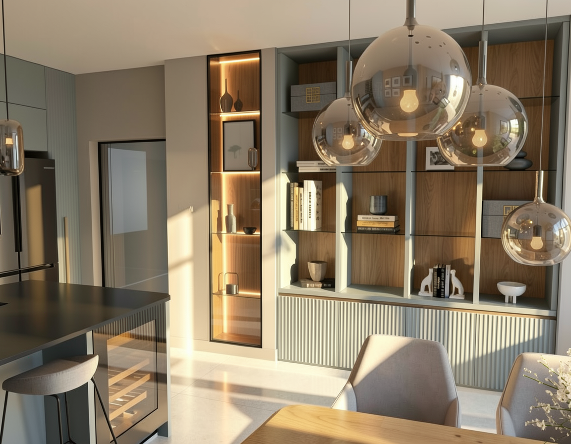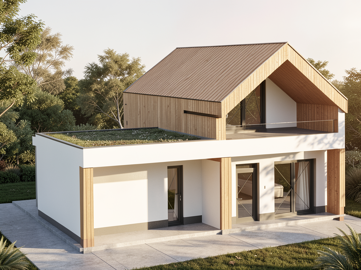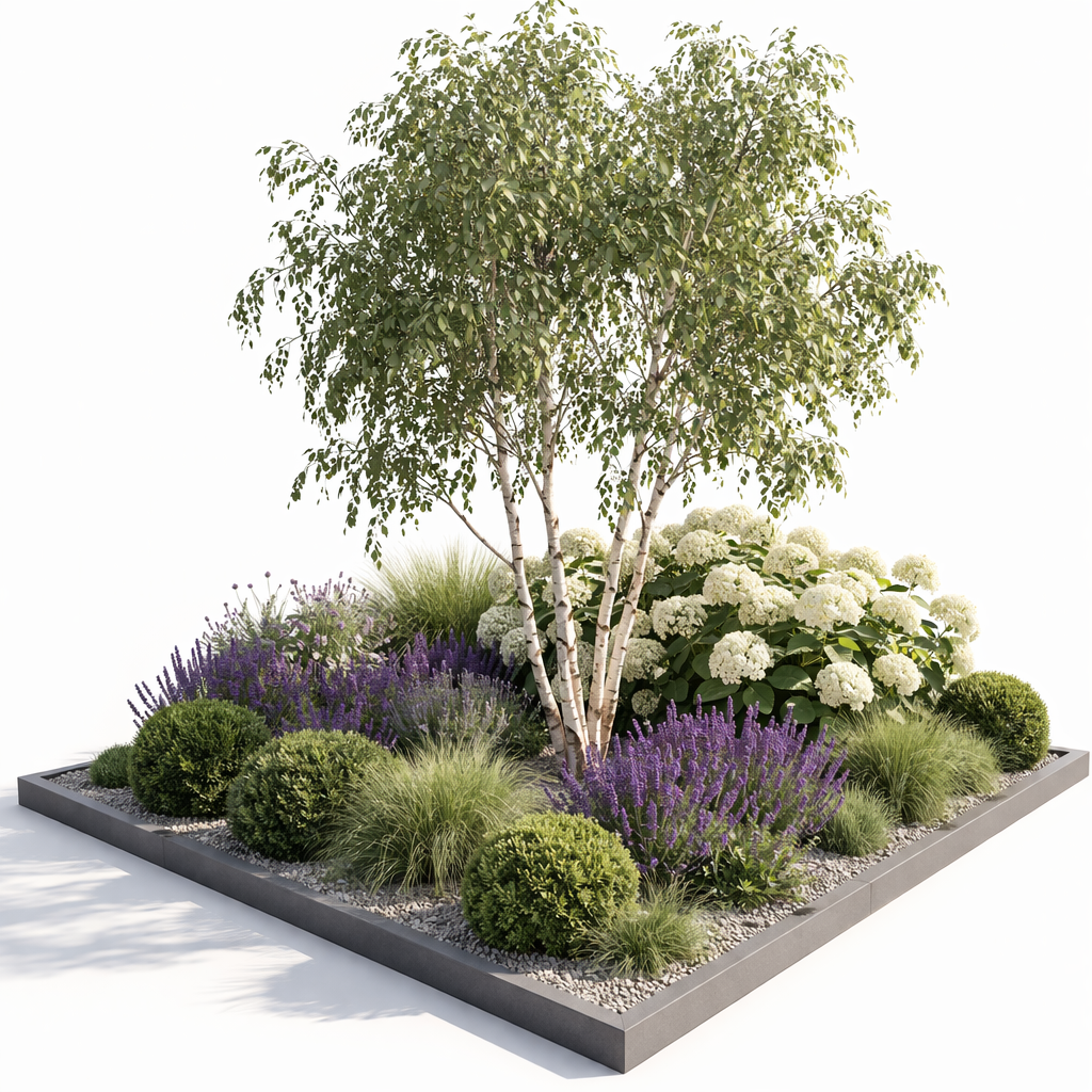 a serene garden scene with a central birch tree its bark a mix of white and subtle gray surrounding it lush green leaves create a gentle canopy at the base soft grasses in shades of lime green contrast with deep purple lavender flowers alongside white hydrangeas bloom abundantly their delicate petals catching the light small manicured shrubs add a touch of order with their rich green foliage the ground is a mix of smooth gray pebbles and dark stone borders adding structure the atmosphere is calm and peaceful with natural light casting gentle shadows