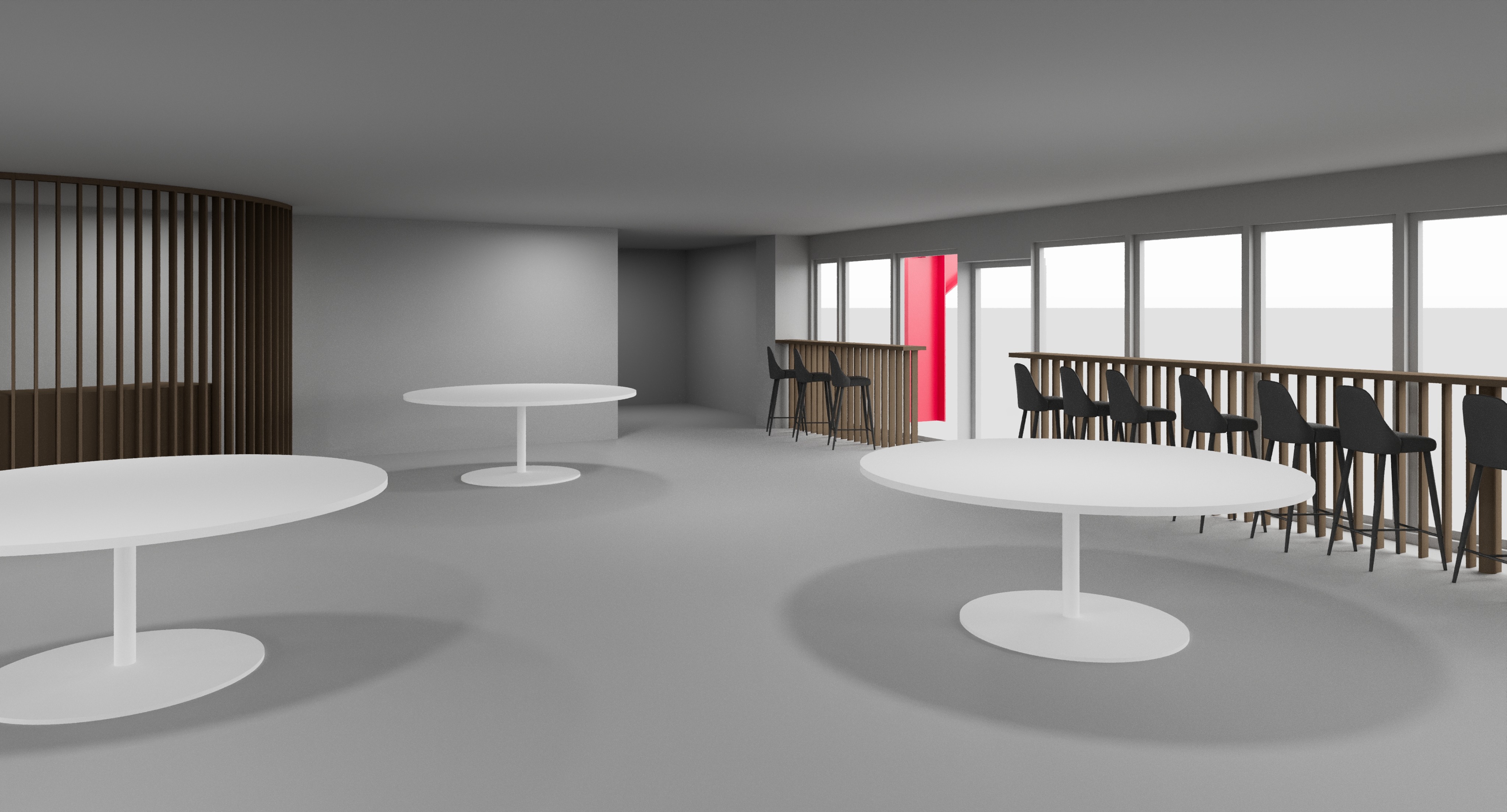 exterior shot create a beautifully rendered image of a sophisticated dining area with modern elements the room features elegant dark charcoal chairs arranged around white round tables the atmosphere is serene and upscale with a soft ambient light casting gentle shadows the floor is a smooth light gray complementing the charcoal chairs walls are a subtle warm gray enhancing the room s minimalist style incorporate a wooden brown partition with subtle curves for depth large windows allow natural light to stream in accentuated by a vibrant red accent wall glimpsed outside providing a bold contrast add lane grid ceiling lots of natural sunlight coming through windows potshelf to the window supported by vertical slats 10 cream chairs around each table dress the tables the same as in the image reference
