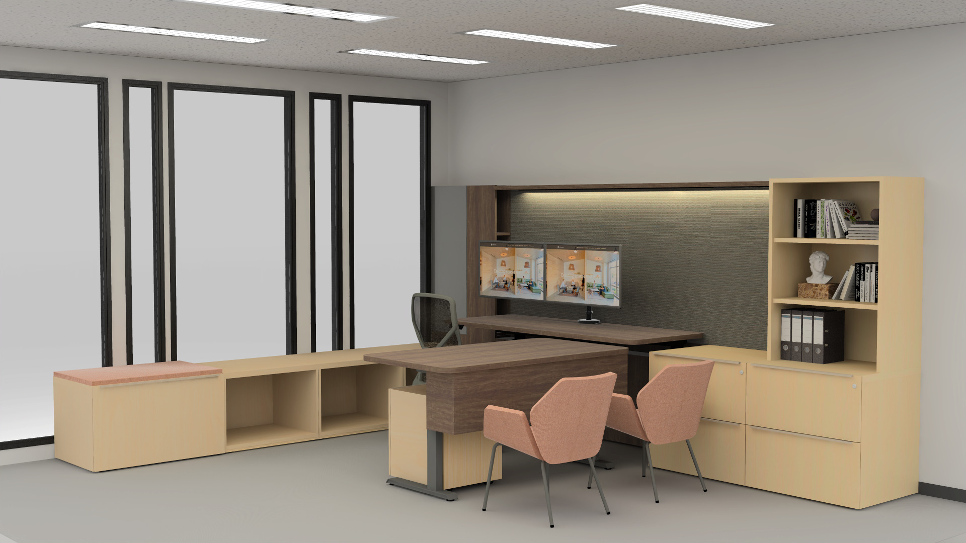 zaha hadid interior shot enhance details and materials add a background of san francisco skyline environment at the window make interior rendering photorealistic do not change any 3d model architecture