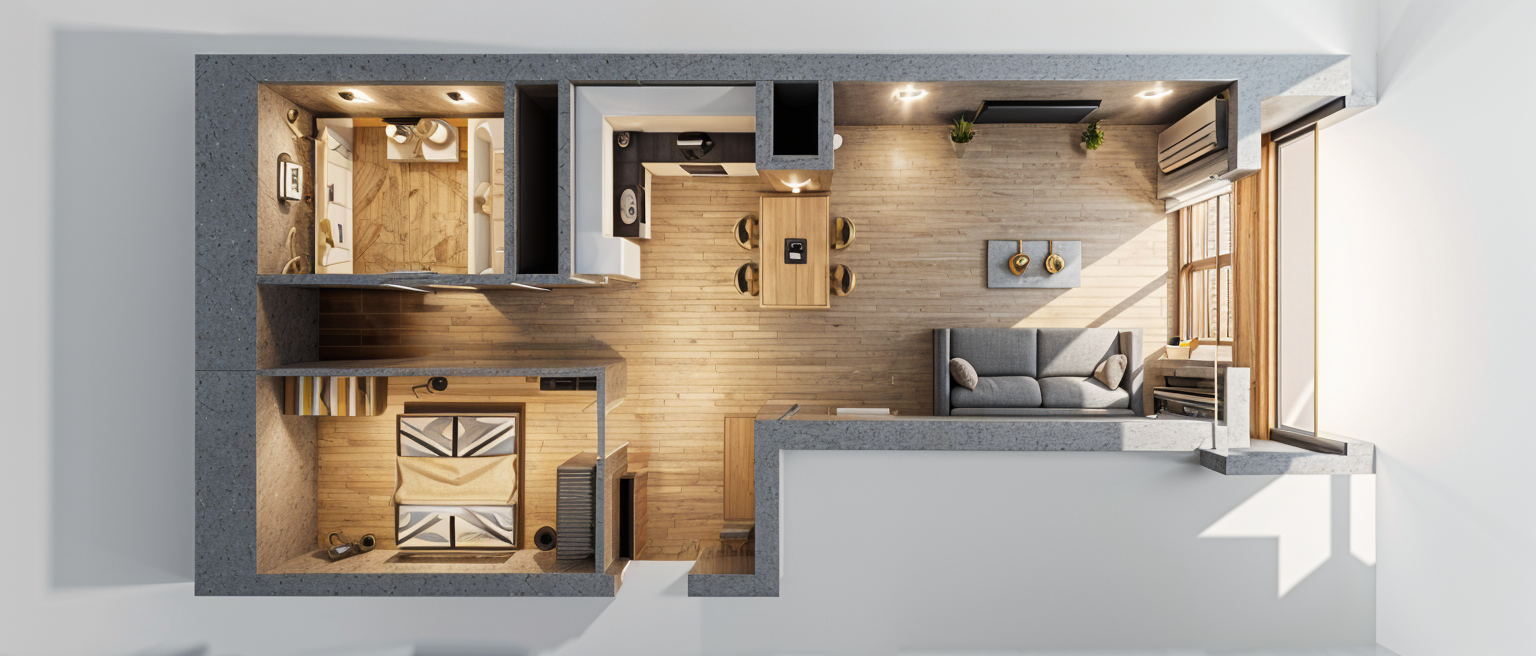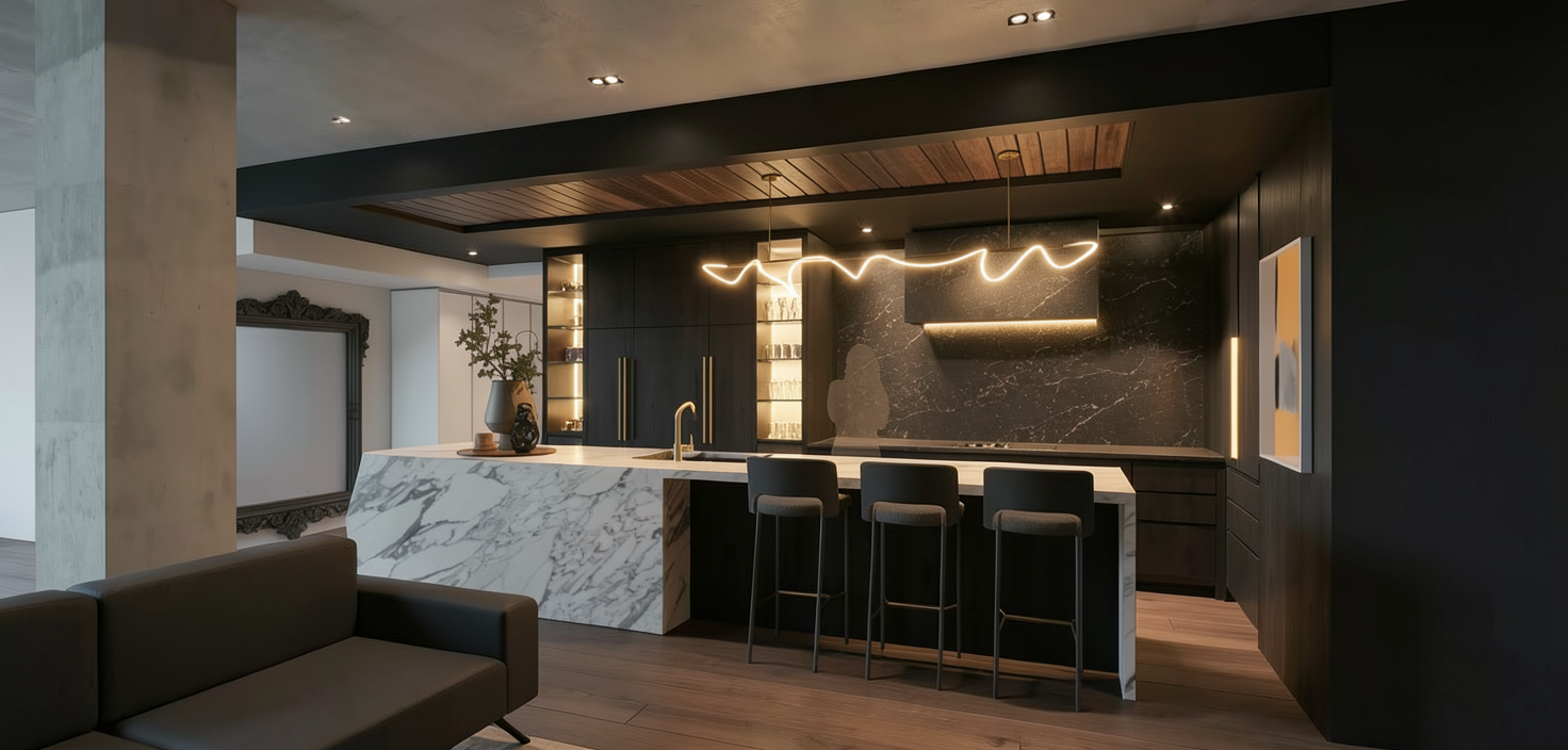 render this contemporary kitchen design in a photorealistic architectural style while keeping all architectural volumes cabinetry layout proportions and materials exactly as shown do not modify the design millwork configuration island dimensions hood bulkhead ceiling details or overall composition maintain brutalist stone island as designed dark stained wood cabinetry almost black back wall in dark stone slab toned brass faucet and metal accents matching dark painted ceiling almost black wood plank insert in ceiling above the island same color as the cabinetry medium brown wood flooring lighting upgrades only no design changes add warm integrated led lighting 2700k 3000k inside the glass cabinets the cabinets have glass shelves and glassware inside introduce concealed lighting under the hood and on either side of the hood enhance the sculptural pendant so it emits a soft warm diffused glow elegant not harsh introduce subtle ceiling spotlights highlighting material texture without flattening it mood atmosphere create a chic warm sophisticated ambiance the space should feel intimate refined and quietly luxurious lighting should emphasize contrast between the deep cabinetry and the luminous marble island the dark wood should read rich and layered not flat black the brass should feel brushed and softly reflective never shiny or brassy the marble should glow gently under warm light revealing its veining overall feeling a high end editorial interior photograph moody yet welcoming dramatic but balanced refined warm inspiring avoid changing materials changing finishes changing proportions overexposing highlights cool lighting temperatures adding new decorative elements render as a photorealistic cinematic interior shot with depth soft shadows and natural light falloff