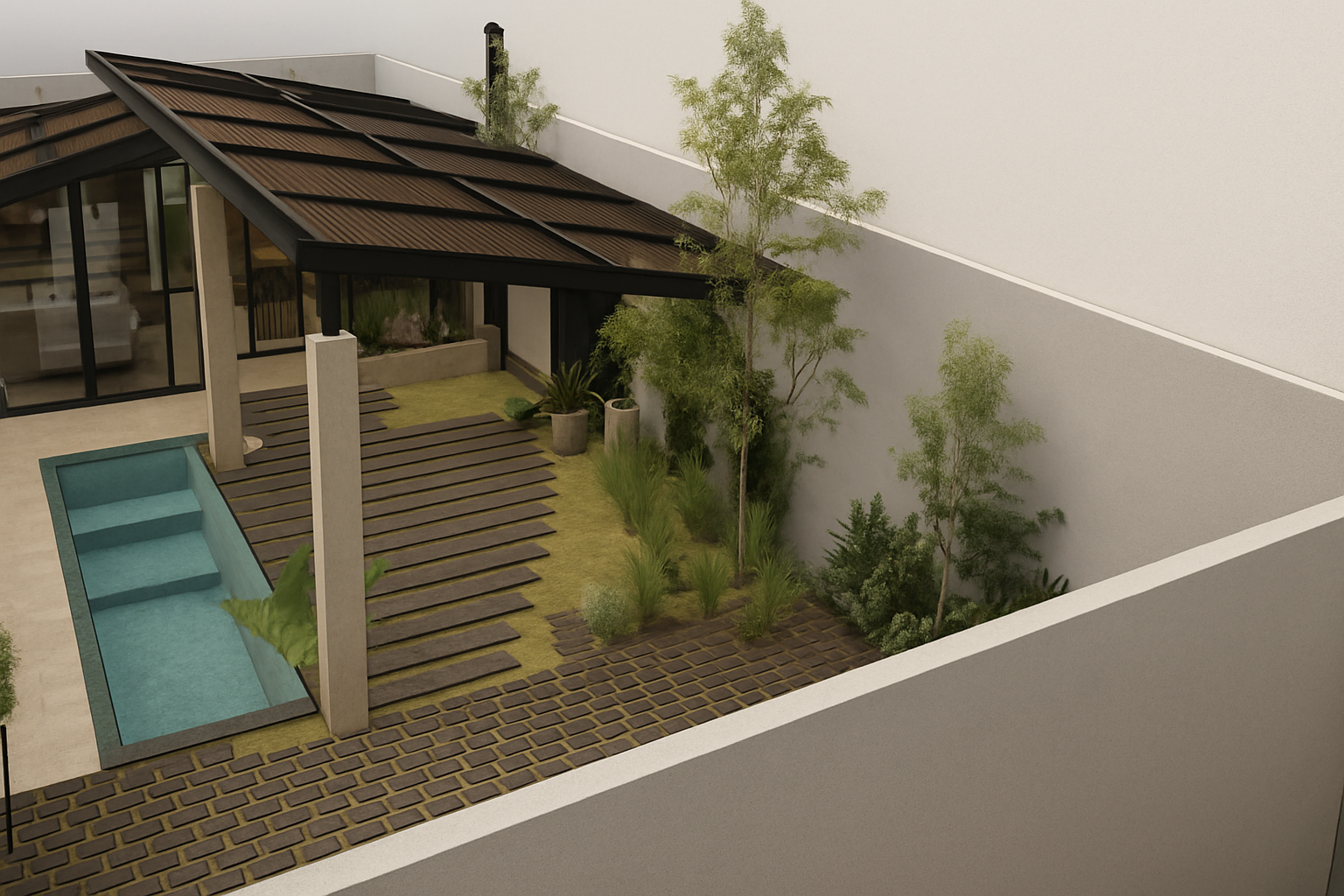 choose best materials with stucco and metal roof add some stone view from 45 degrees