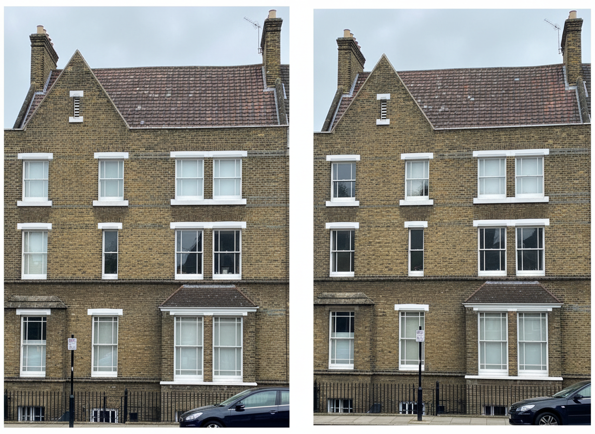 elevations using dirty london stock brick old clay tiles and white timber windows with concrete lintels above