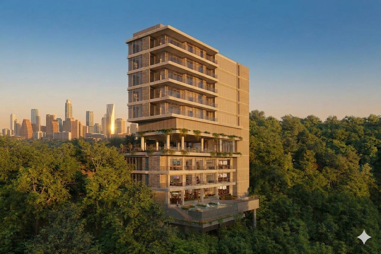 put the city behing the forest to a slightly lower elevation do not change anything else including the lighting or any of the building s details
