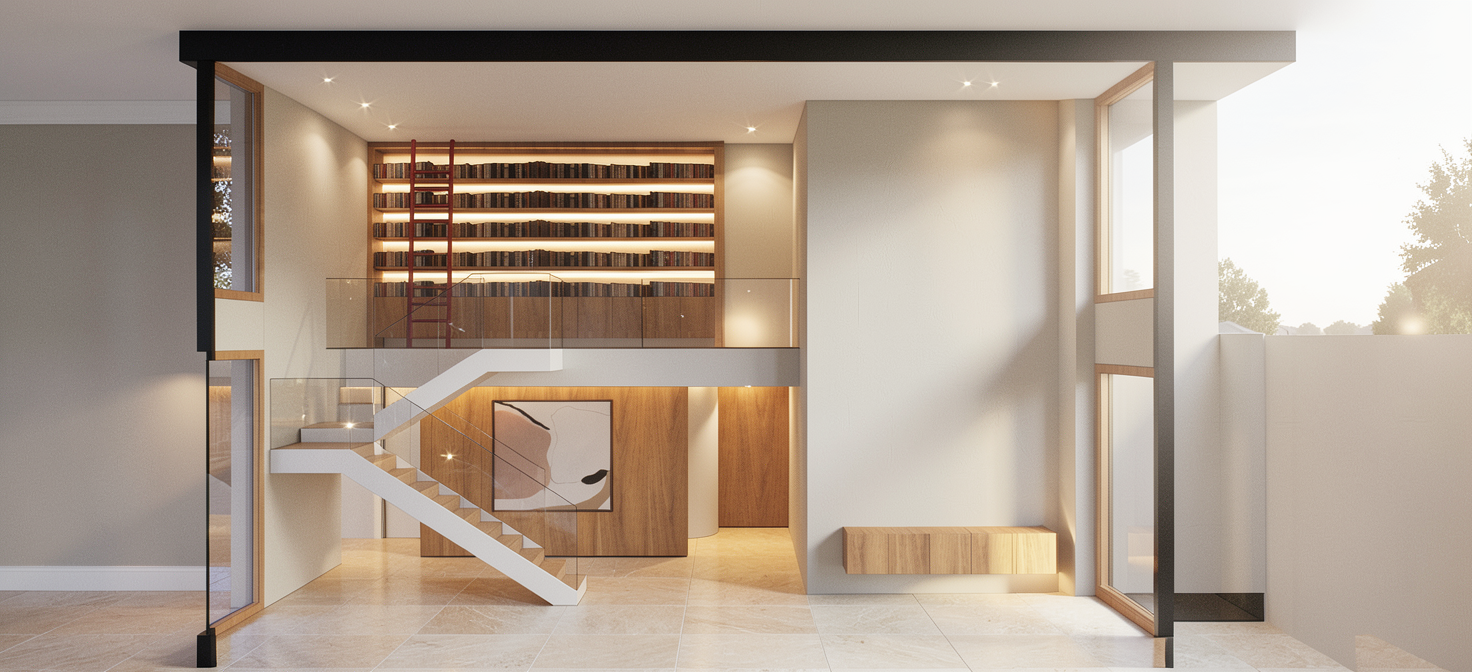 render this view as a photorrealistic architectural render floors should be in a large light beige natural stone material