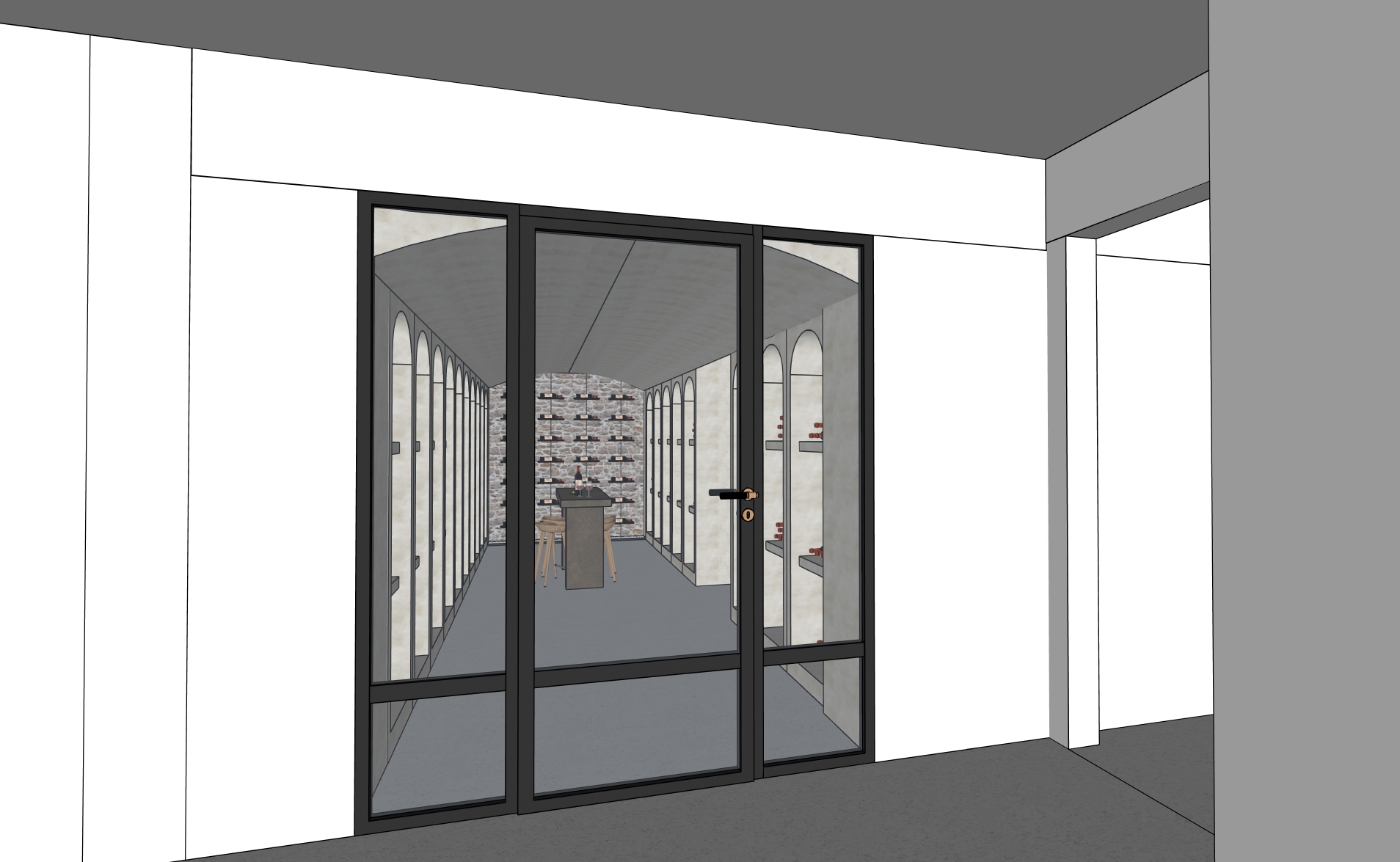 a photorealistic architectural rendering of the same elegant wine cellar interior maintaining the exact same materials and architectural language as the previous view the space features soft beige lime plaster walls and a perfectly flat straight ceiling finished in the same lime plaster creating a seamless continuous mineral surface the floor is finished in smooth grey beige polished concrete with a slightly lighter tone to create a softer and more luminous atmosphere along the back wall the same rustic natural stone wall as in the previous view is reproduced with identical texture color and irregular stacked stone pattern ensuring visual continuity the decorative pebbles on the floor are removed and the wooden cabinet below the stone wall is extended fully down to the floor creating a clean continuous base with the same warm natural wood material and dark stone countertop a small integrated sink remains centered on the counter maintaining the minimal and refined preparation area arched wall niches continue along both sides displaying wine bottles stored horizontally preserving the original layout and architectural rhythm the niches are softly backlit with led lighting to illuminate the bottles and emphasize the depth of the alcoves the lighting is warm and atmospheric with only two discreet recessed ceiling spotlights centered on the ceiling illuminating the space the scene emphasizes material realism soft shadows subtle reflections global illumination and high end architectural photography quality while maintaining the exact same design language proportions and materials as the previous wine cellar view