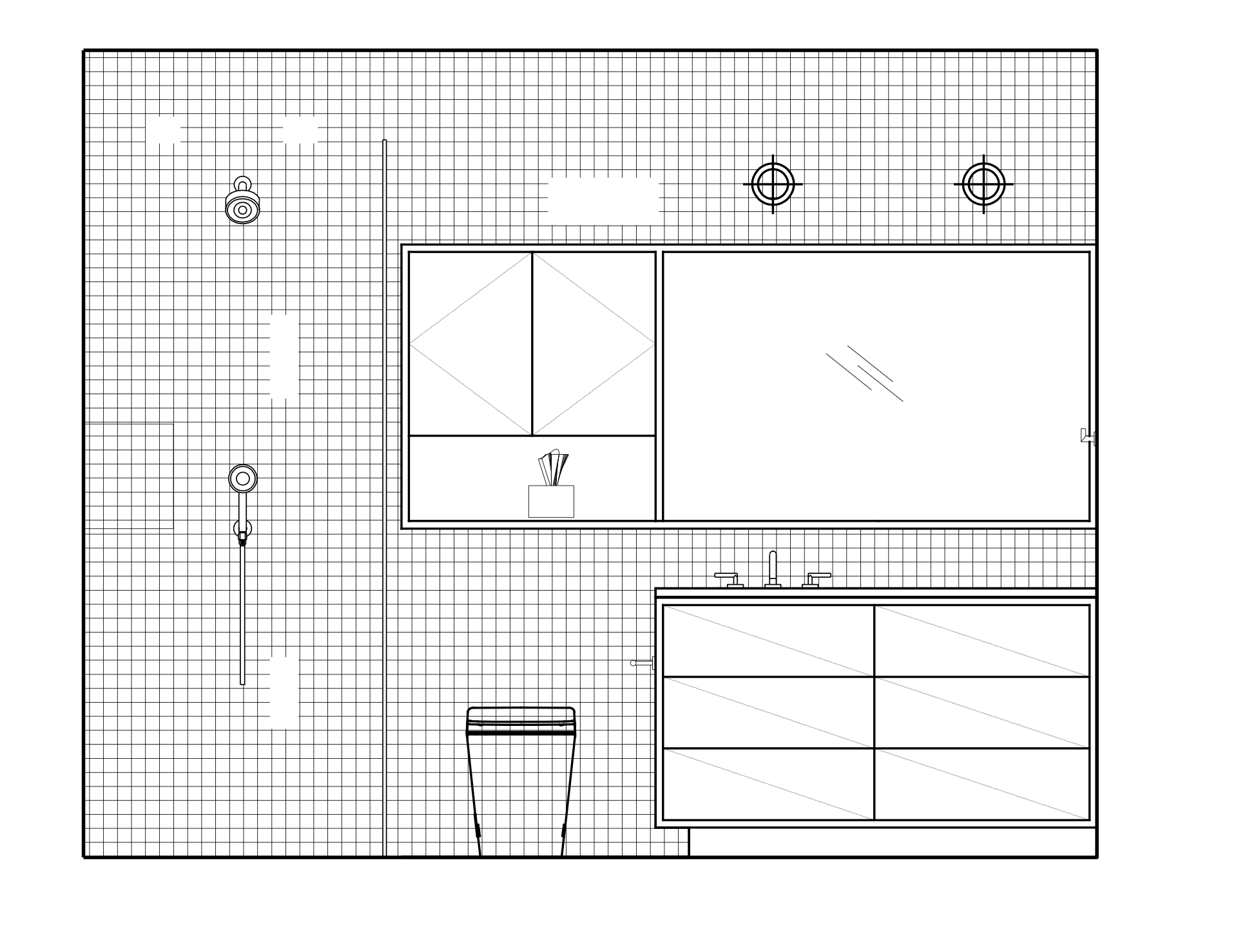 modern bathroom 2x2 square cream tile with matching grout on all shower walls floor and wall behind toilet and cabinetry white painted walls everywhere else walls with matching grout brushed nickel plumbing fixtures cabinetry is ash in a natural stain countertop is a warm beige gray stone mirror and upper cabinetry is flush with the wall with 4 wood ledge toilet is white tankless with open shelf and cabinetry above curbless shower with glass door 12x14 niche next to handshower