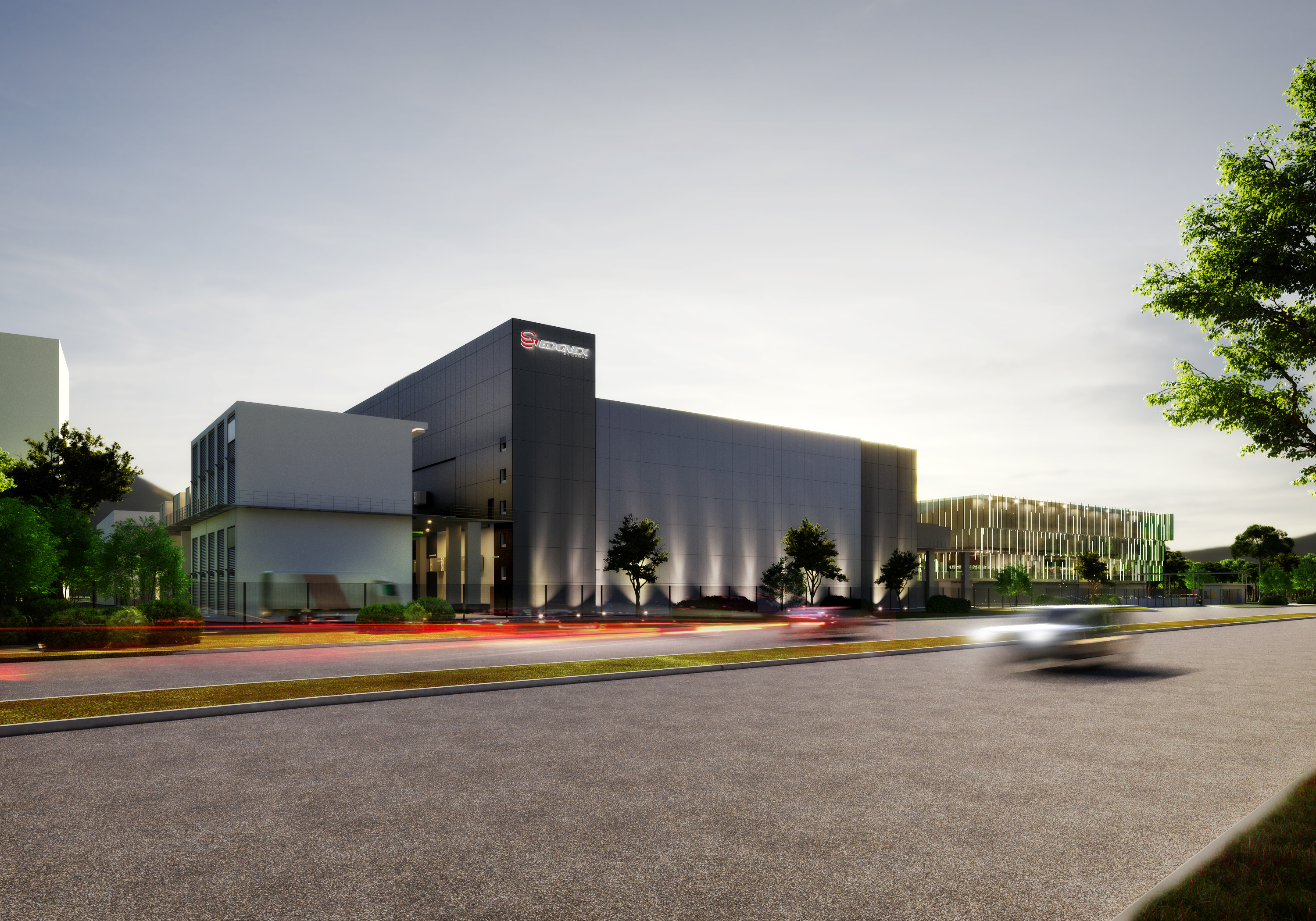 exterior shot a modern architectural complex with sleek minimalist design the main building is clad in reflective glass and polished steel radiating a cool blue hue that mirrors the sky surrounding structures are finished in clean light gray concrete the pathway is a smooth neutral gray leading to the entrance the atmosphere is calm and inviting set under a clear bright sky casting soft shadows lush greenery in the foreground provides a vibrant contrast rich in shades of green