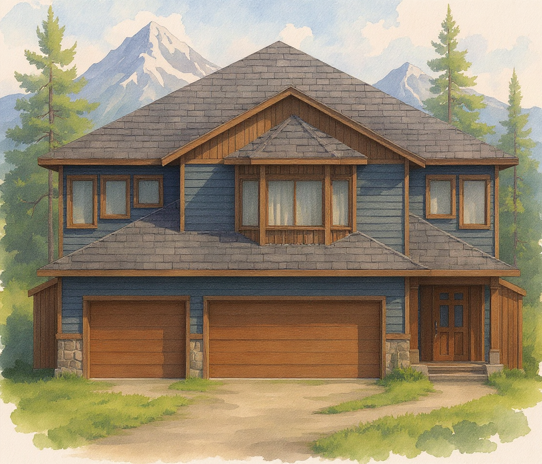 grainy watercolor render of craftsman style home painted white watercolor trees and mountainous alaska environment in the background simple driveway and walkways in front of the home