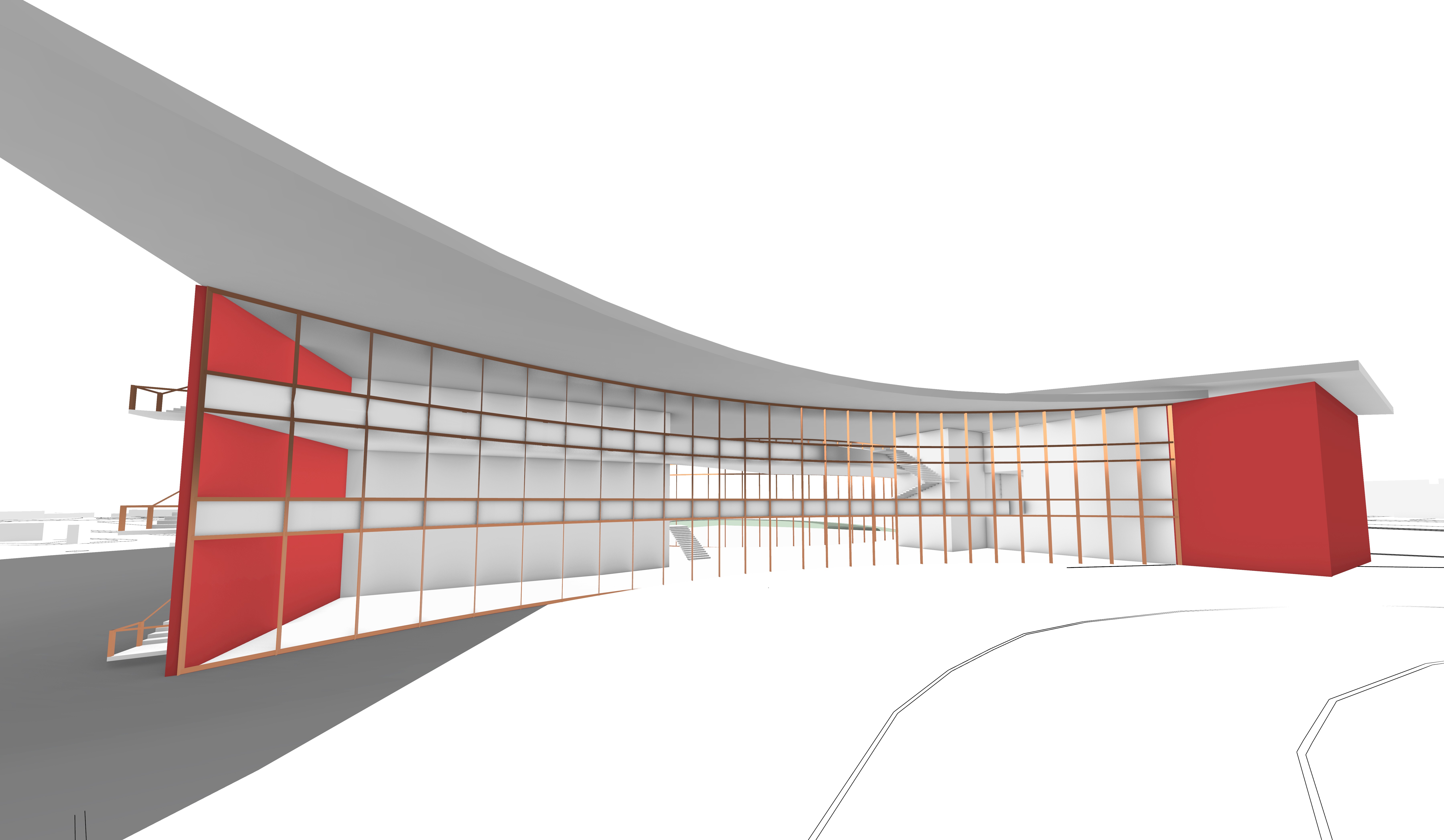 exterior shot render a modern architectural building with a sweeping curved design featuring a bold brick exteriorl the building facade is dominated by large glass panels framed in light brown allowing natural light to pour through incorporate soft grey tones for the roof and add subtle shadows for depth the building stands on a smooth charcoal colored ground surrounded by a public par with fields and trees capture a serene atmosphere with bright daylight and a clear sky emphasizing the building s elegant architectural lines and vibrant contrast of colors