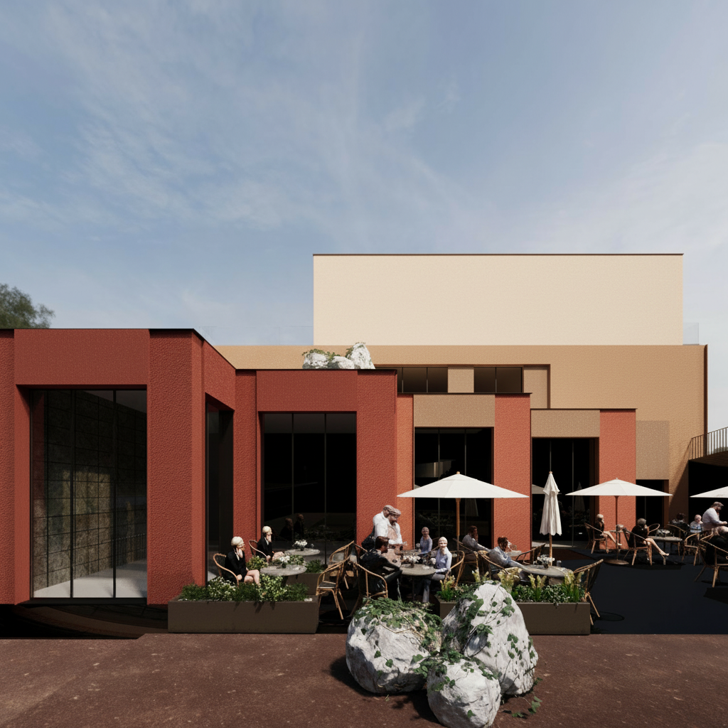 the top of the building ivory colour all of the bottom floor to be turned from brown to red terracotta