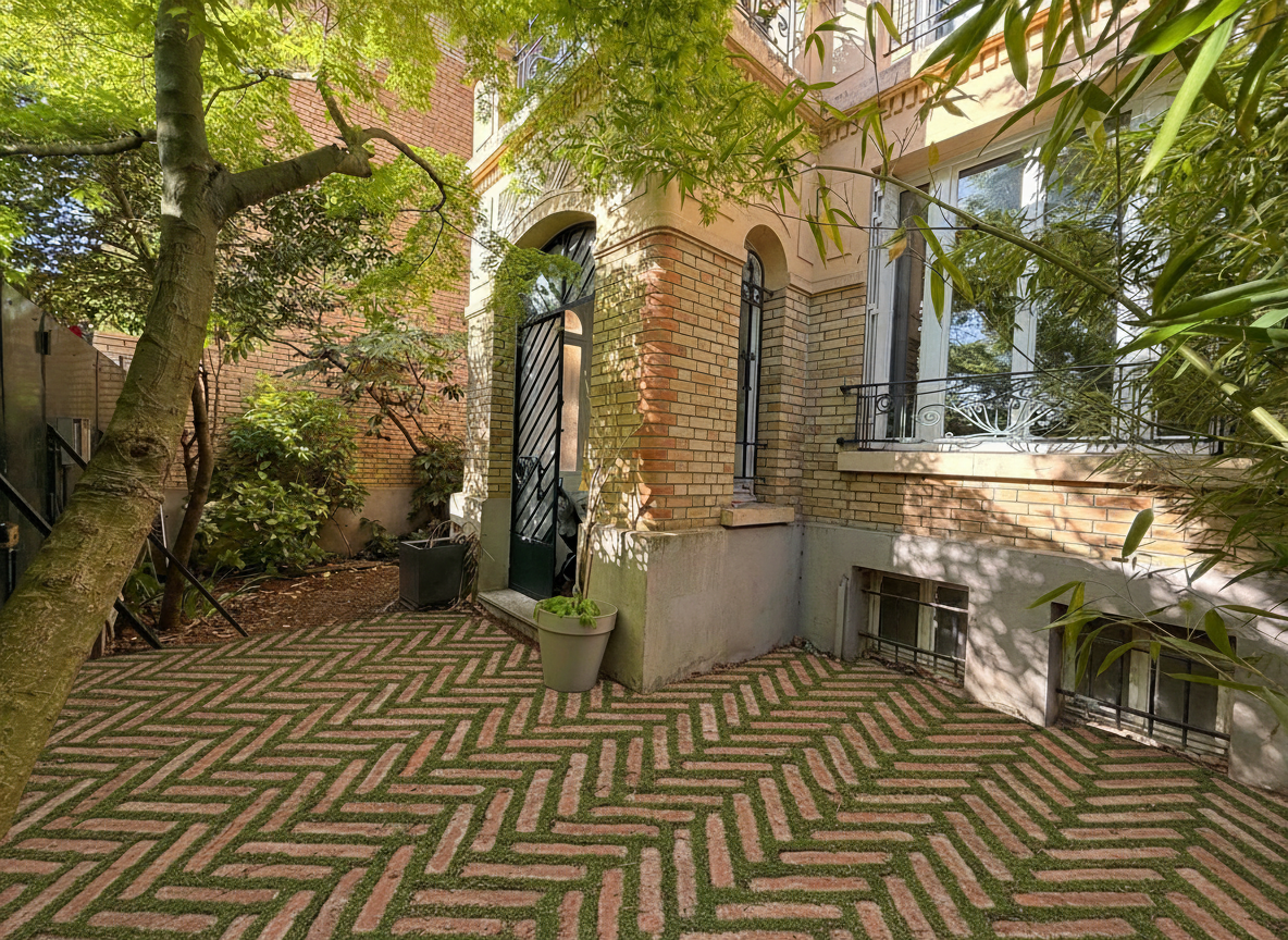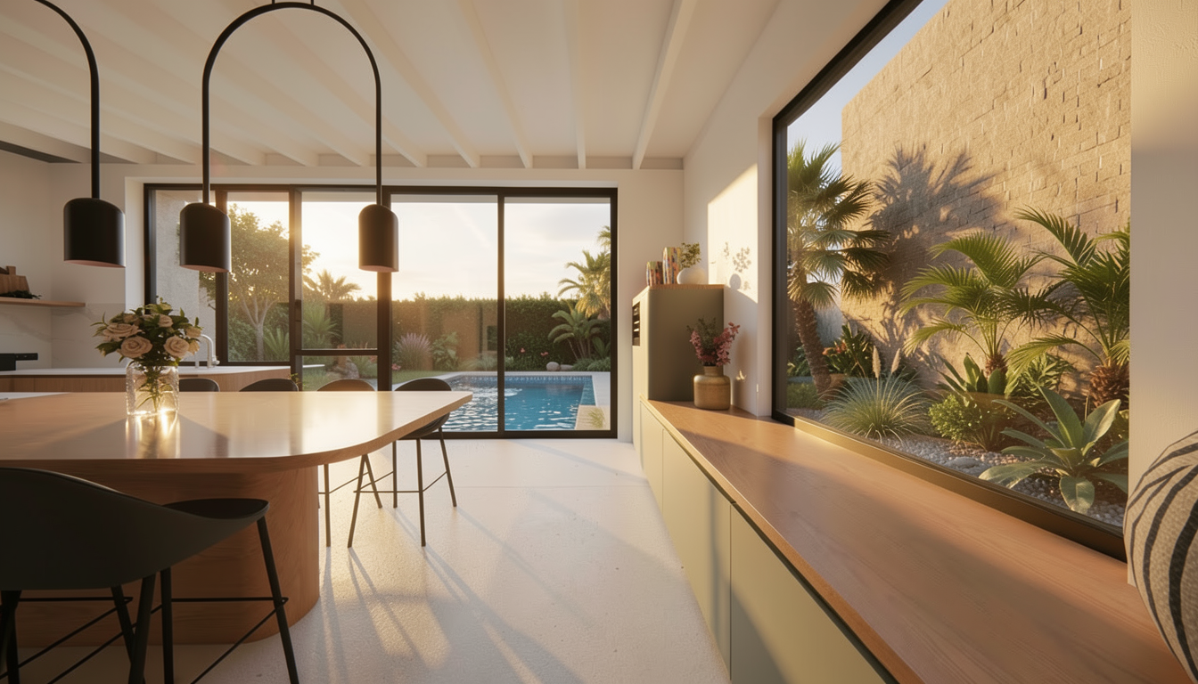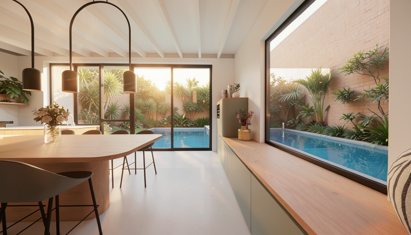 add realism and warm effect back ground exterior with a swimming pool on the long side and vegetations