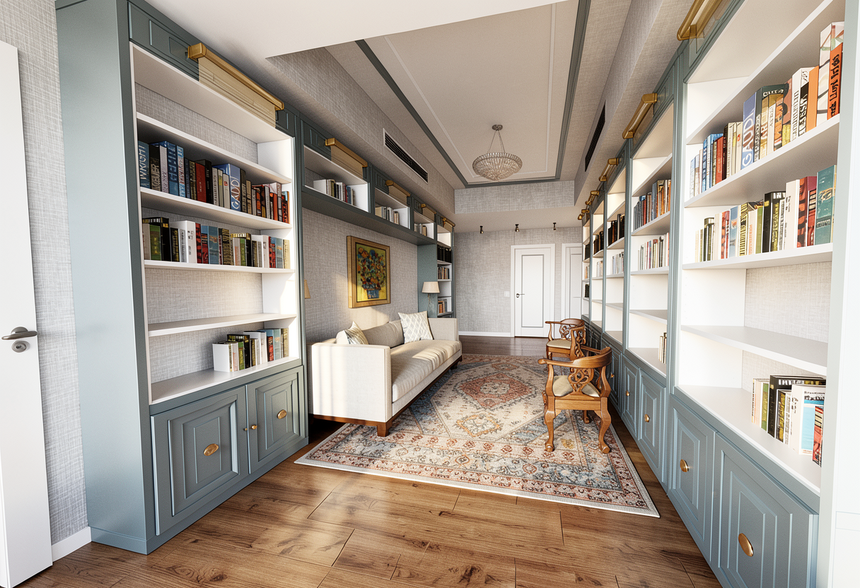 luxurious interior of an a well lit master bedroom with a feature wall in the middle of the room with the walk in wardrobe area in the left