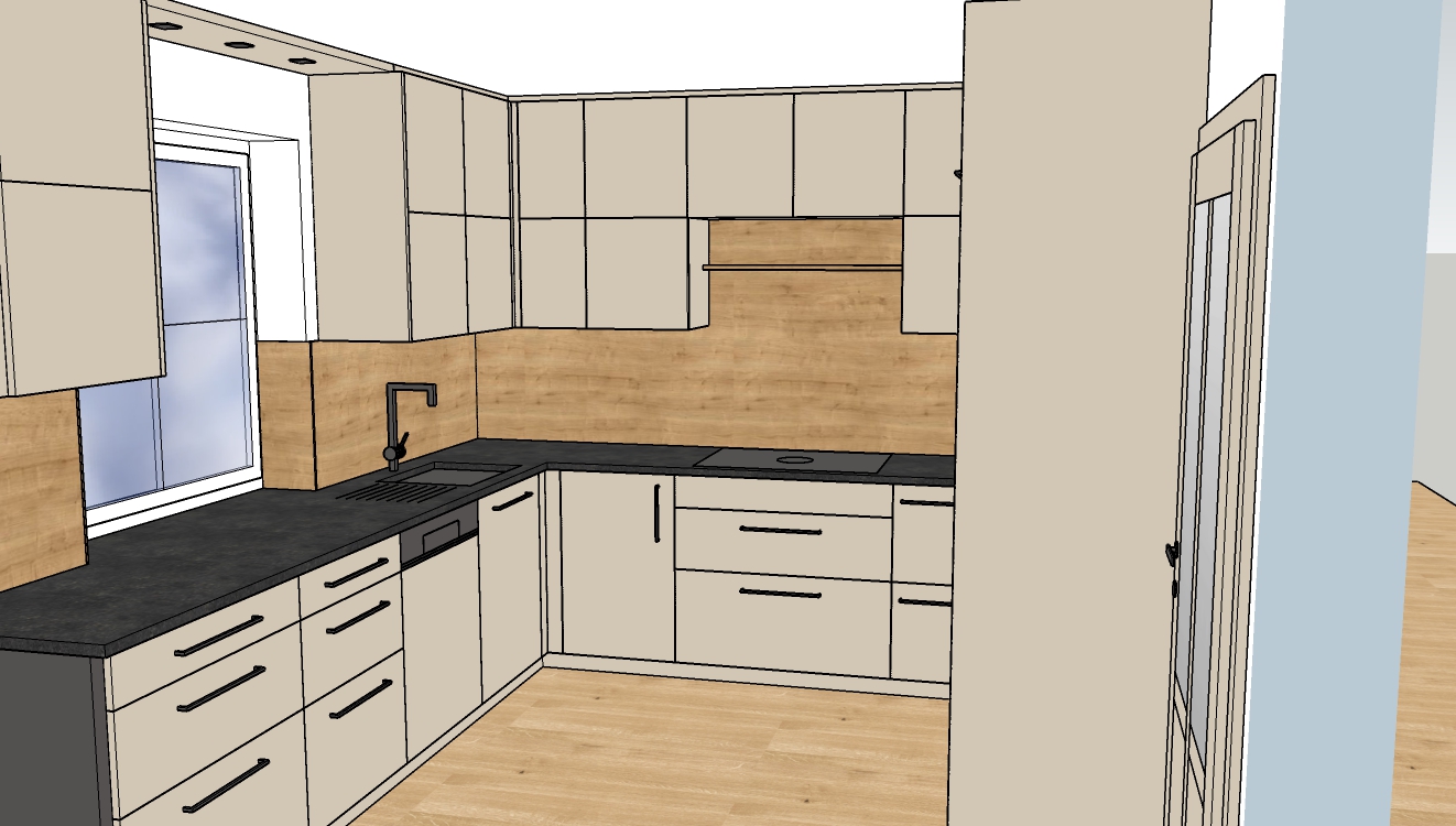 erstelle mir eine realistische aufnahme von dieser k che mit einer dunklen steinarbeitsplatte champangerf rbigen fronten einer holz nischenr ckwand die h ngeschr nke sind raumhoch bis zur decke und ber dem fenster geht die blende dar ber mit spots architecture