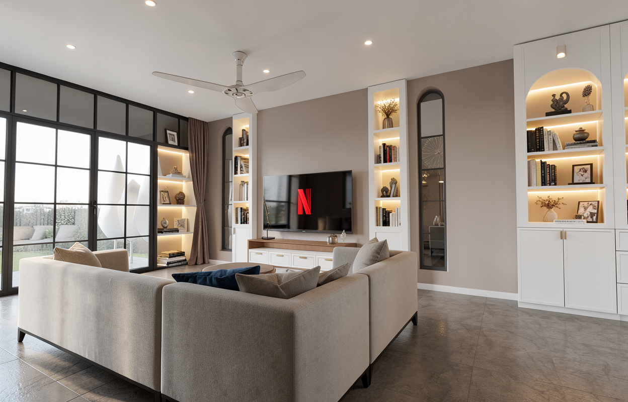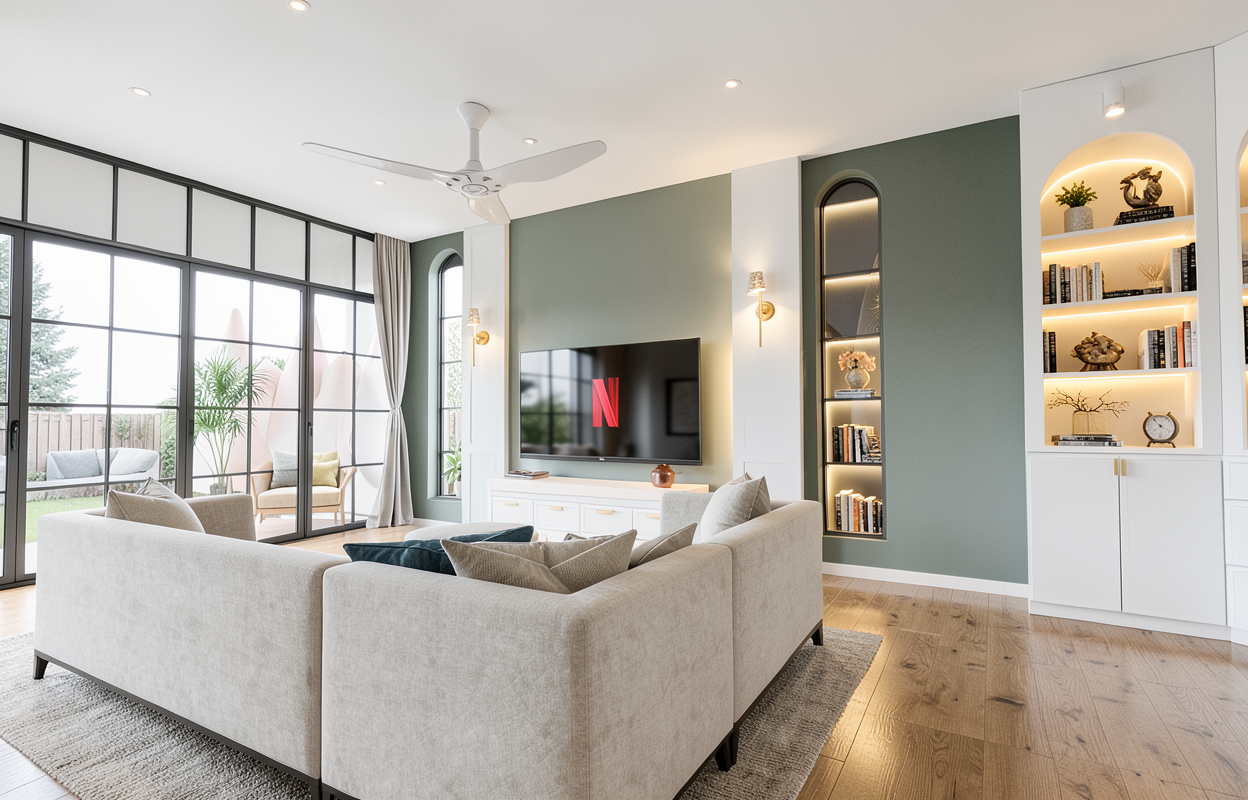 glossier floor only add decorations to one bookshelf solid white bookshelf do not change the color of the feature walls add led lights inside of the cabinets of bookshelf windows and door don t need decorations