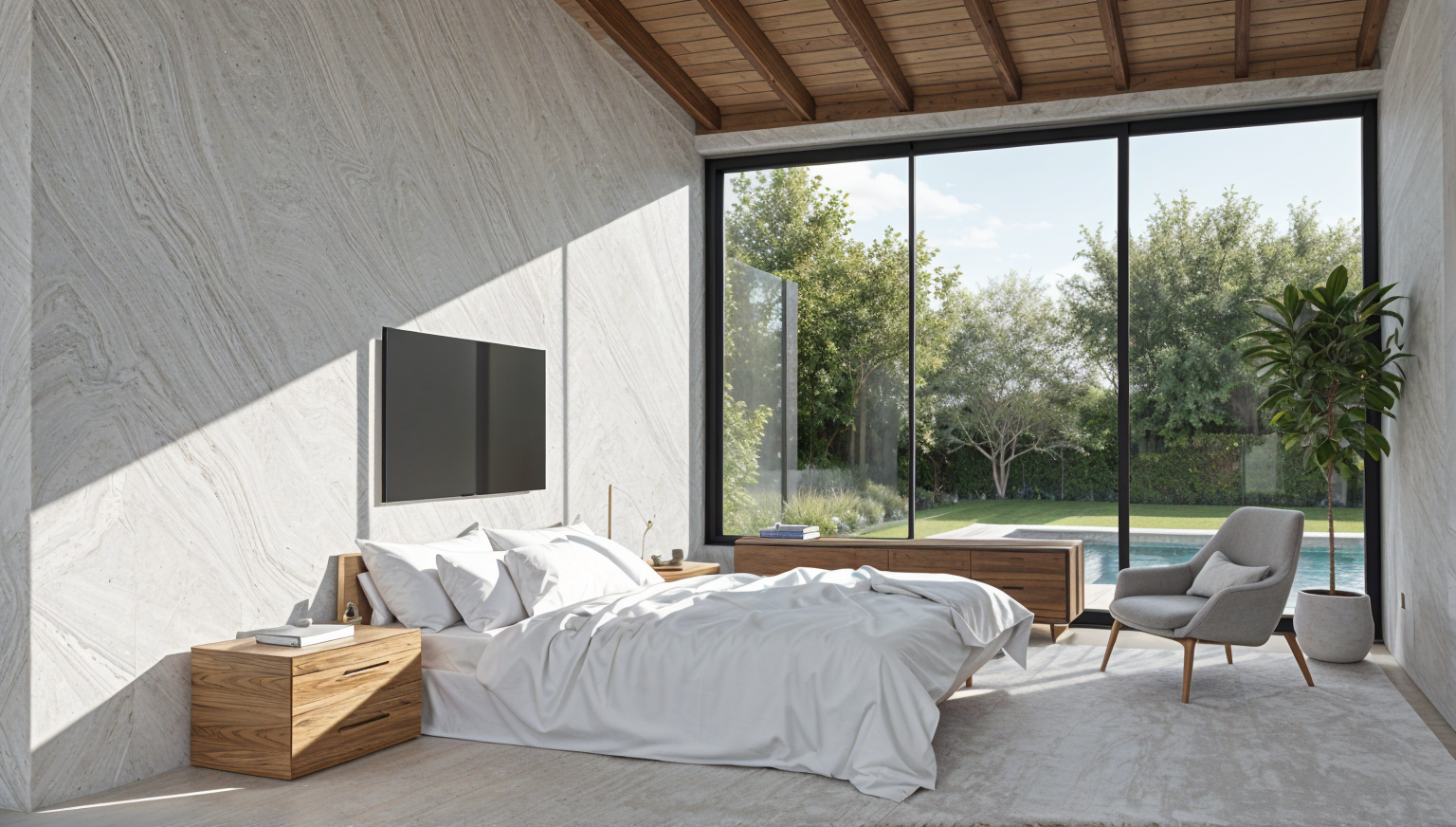 modern living room with light grey tile flooring and white walls large gray sectional sofa facing a flat screen tv mounted on the wall with a low wooden console beneath there is clear space between the sofa and the tv console to allow people to pass through toward the windows on the left a wide window with sheer cream curtains fills the space with natural daylight on the right side two smaller windows with light wood frames and sheer curtains separated by a white column with a gray ottoman placed nearby the kitchen island is visible with three leather bar stools ceiling finished in dark gray bright realistic daylight cozy and contemporary atmosphere