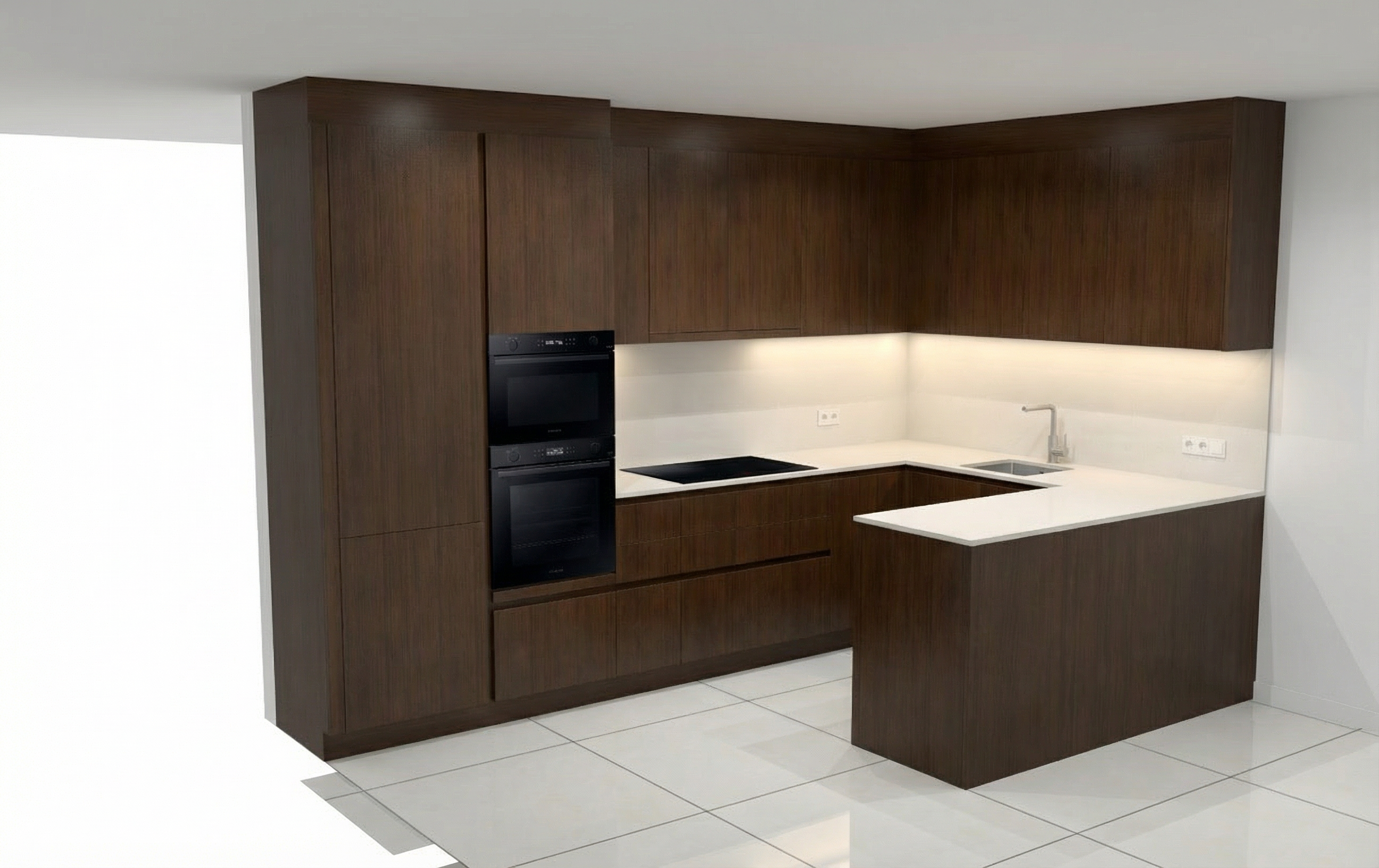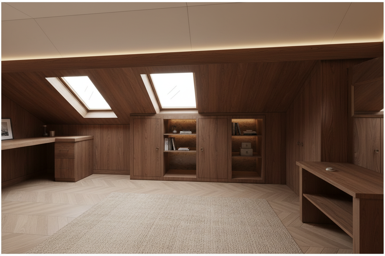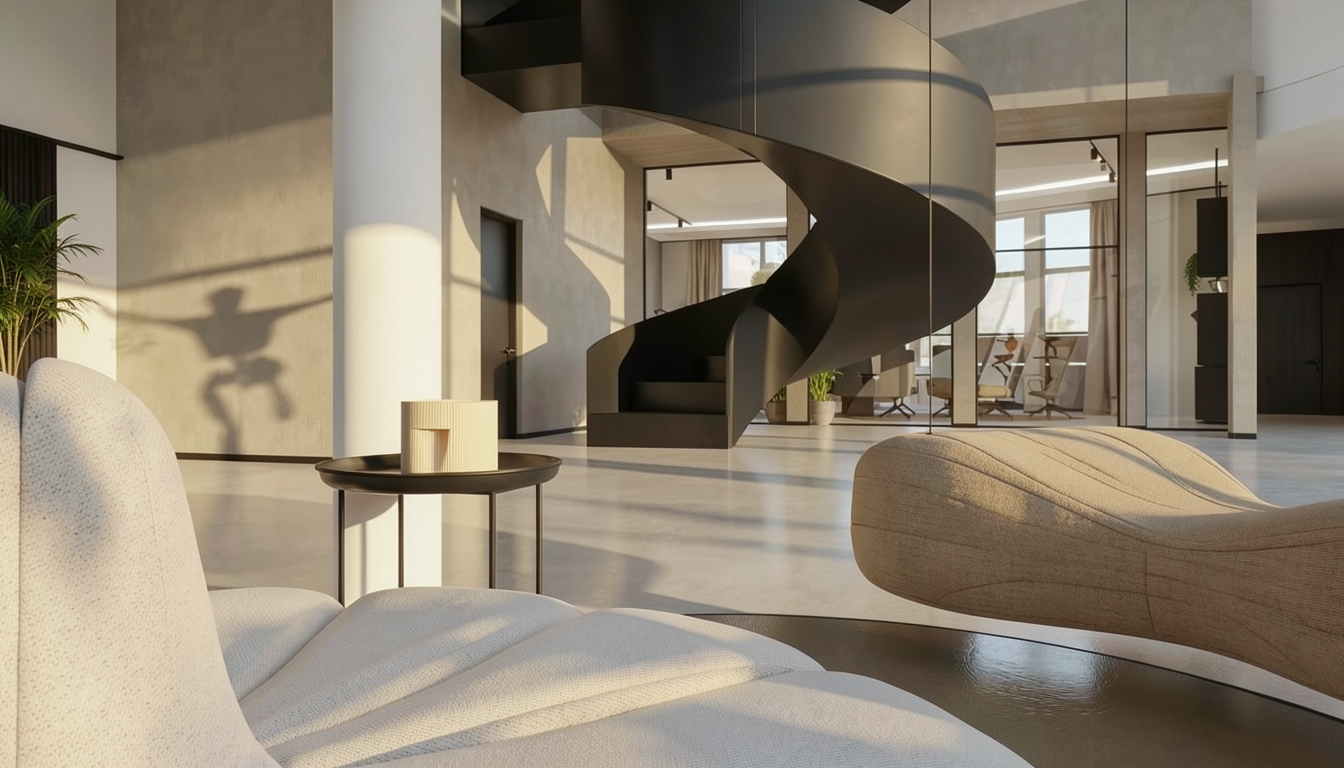 keep the exact same table same material same geometry and proportions focus only on ambience and lighting create a more cinematic luxury atmosphere with softer indirect light deeper shadows warmer tones subtle light gradients on the walls more depth and contrast high end architectural photography style editorial interior mood calm and sophisticated