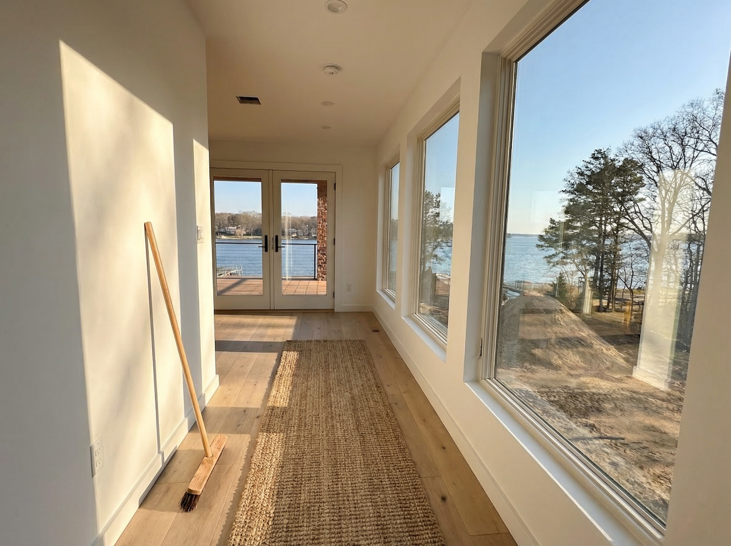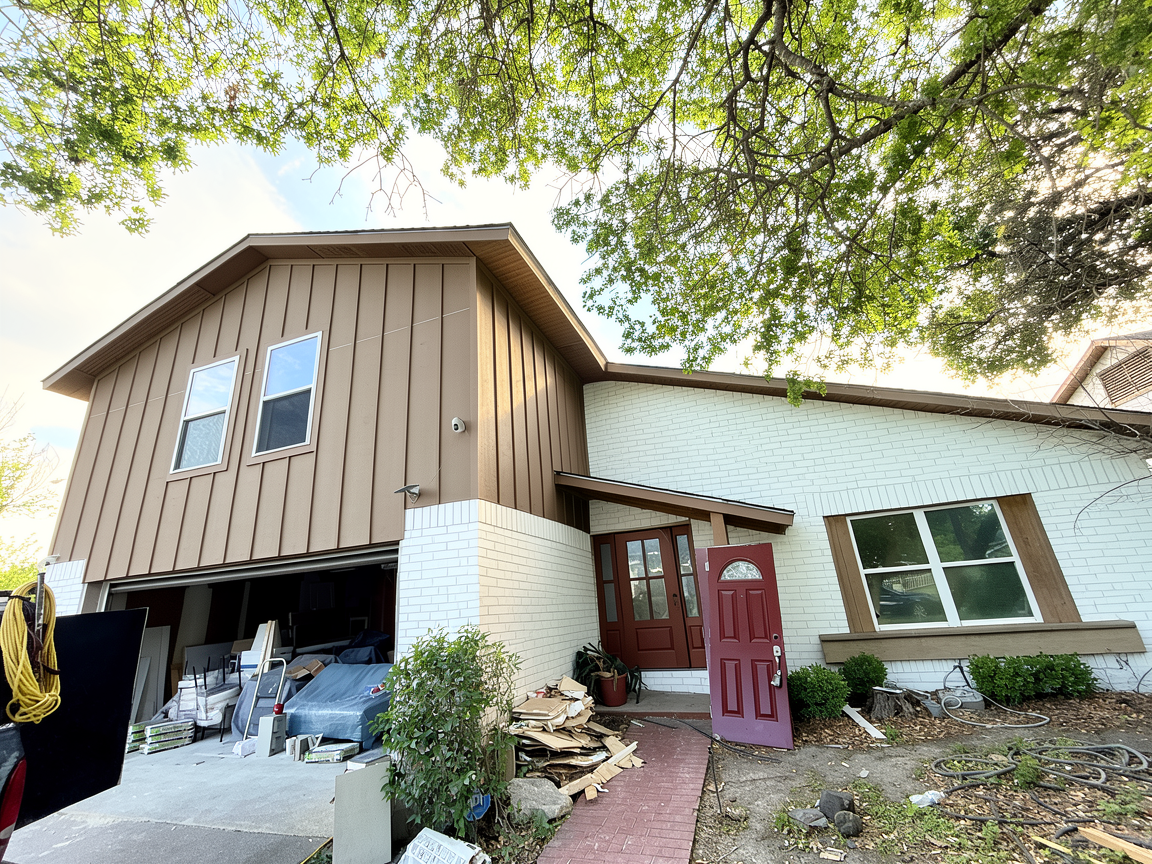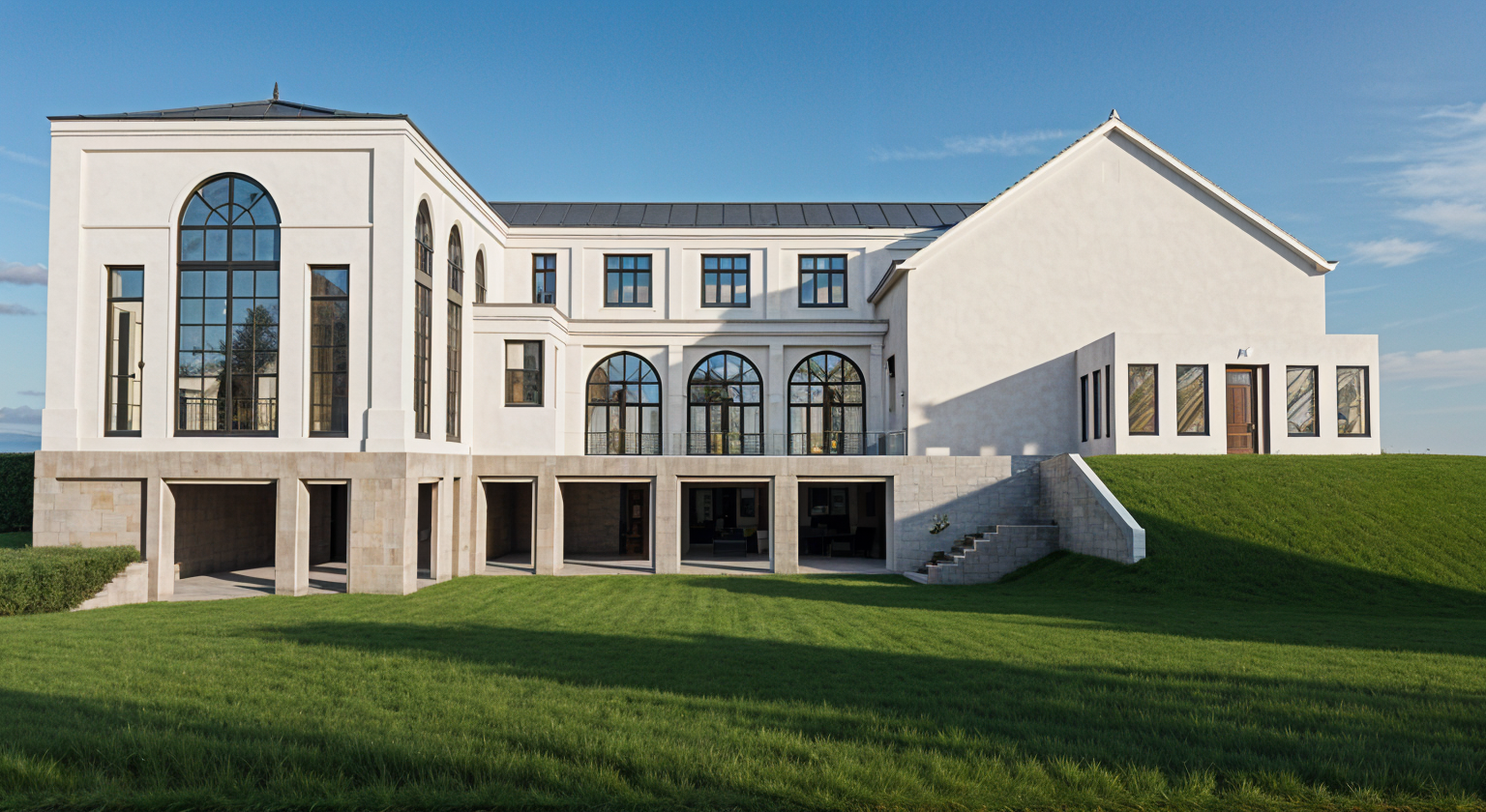 big bjarke ingels group exterior shot this house is located on a lake this elevation is on the street side and has no view of the lake it is on a wooded lot in wisconsin the house should have vertical siding in a light cedar color the house should be a mountain moden style architecture