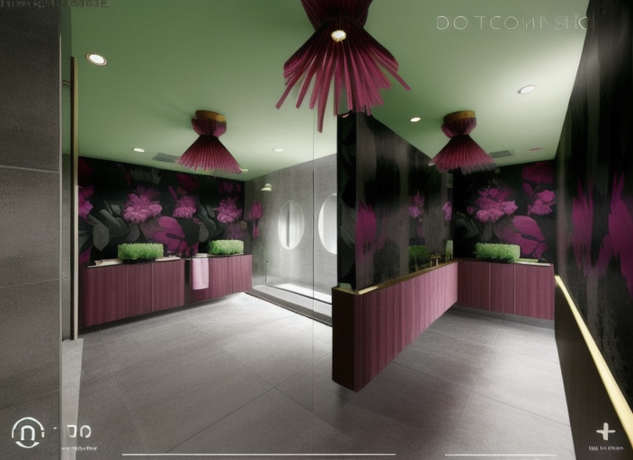 modernist interior shot luxurious dining room oval wood dining table that sits 6 chairs round back dining chairs with sage green upholstery large and wide arched window on back wall with black iron framing afrocentric artwork on left wall modern console on left wall large scale plush area rug black ceiling modern chandelier centered in room walls to be cream colored wood flooring architecture