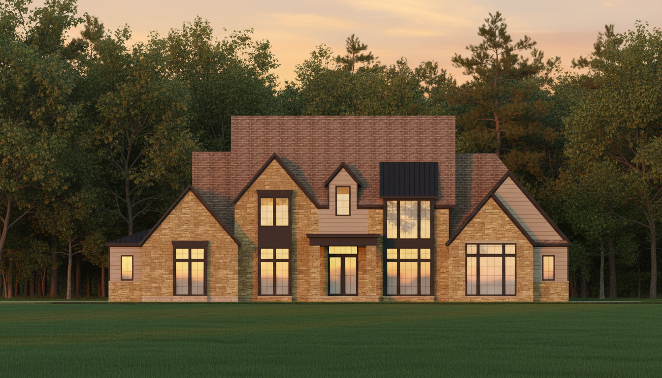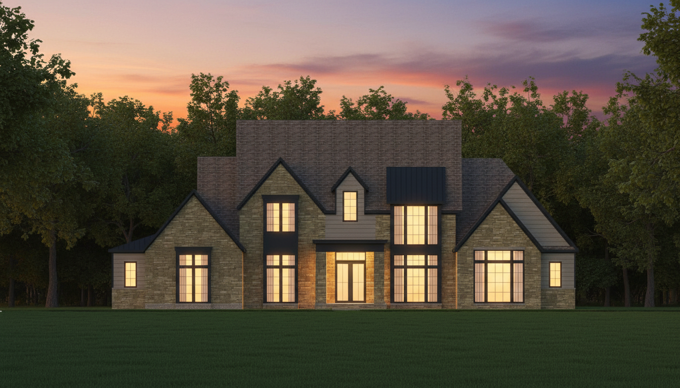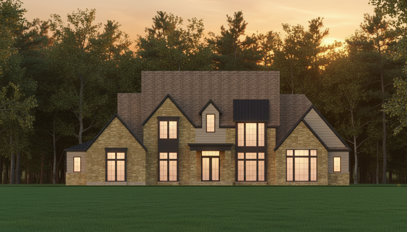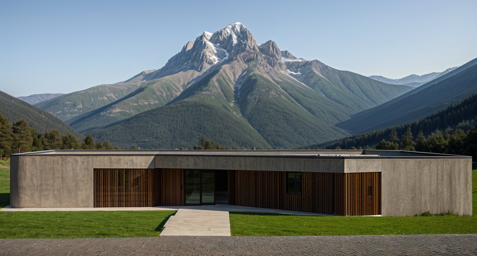 replace wooden cladding with photorealistic vertical natural slatted wood keep the original stone wall texture exactly as in the photo unchanged replace the background with a neutral minimal one soft grey or white without sea or landscape elements add more plants including small shrubs low growing flowers and a few larger ornamental bushes in front of the house to enrich the landscaping ensure high resolution photorealistic architectural rendering architecture