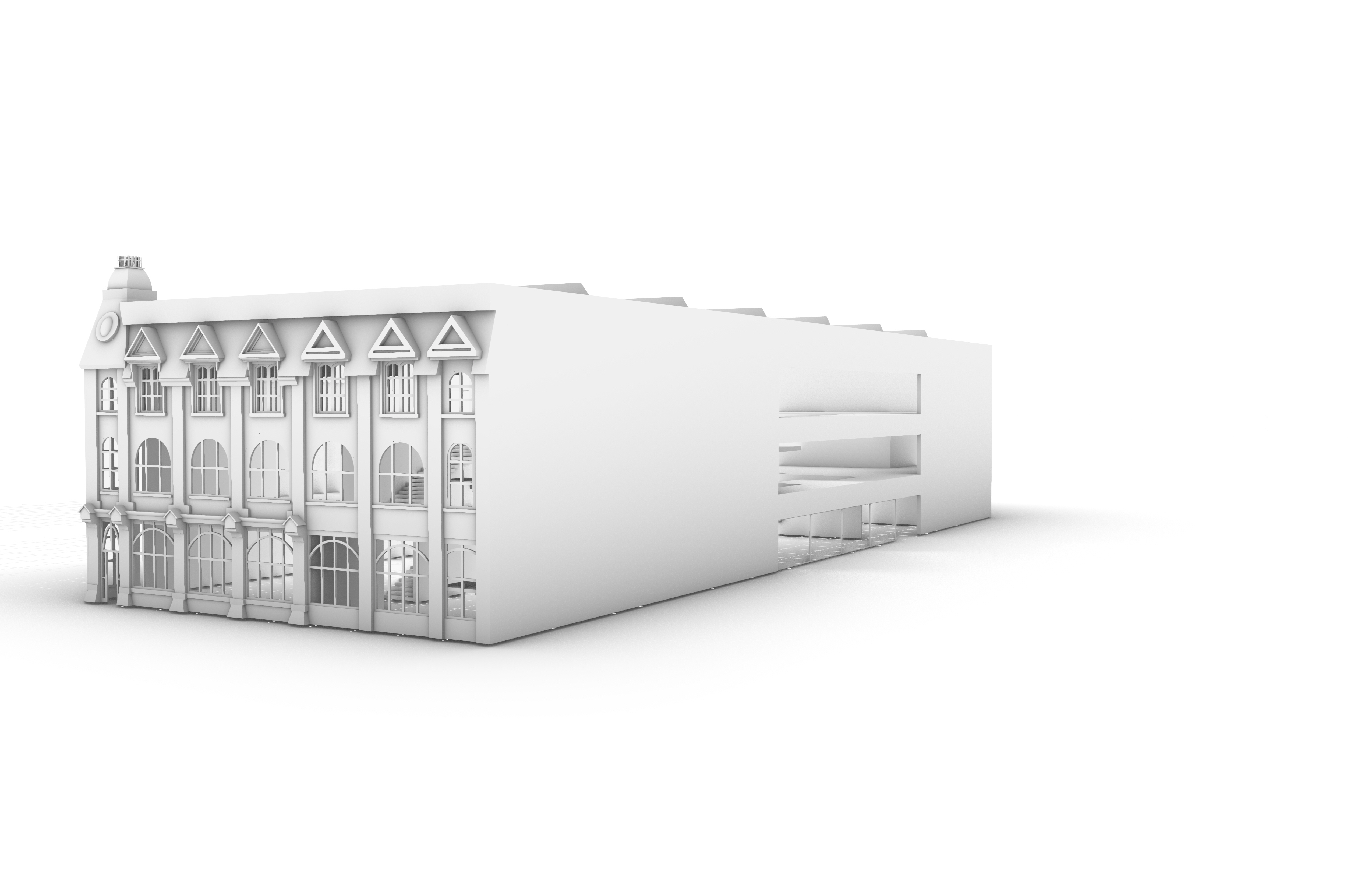 historical white stone front facade public exterior space at the right with children plaground concrete for the other walls architecture