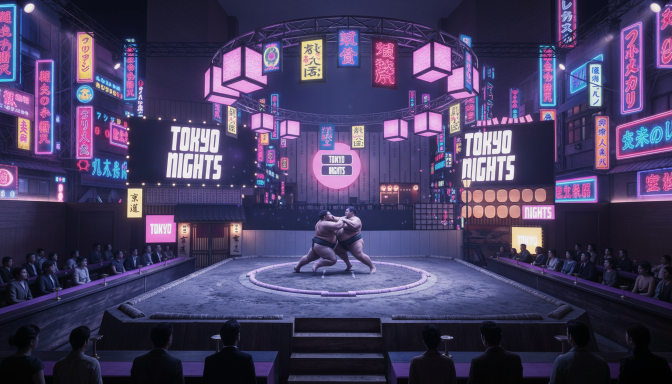 exterior shot moody dark sumo show with a lof of lights on the sides but keep stage as the original one make it realistic